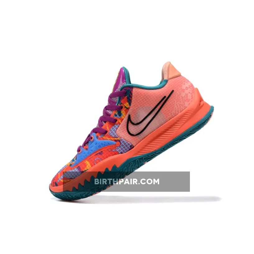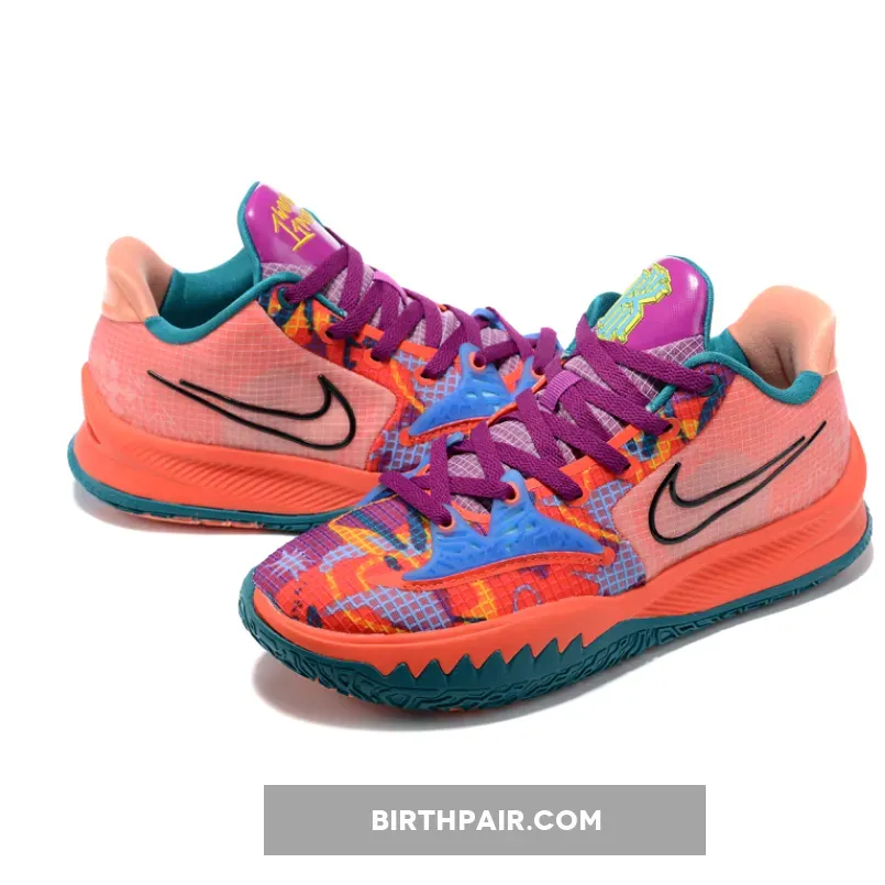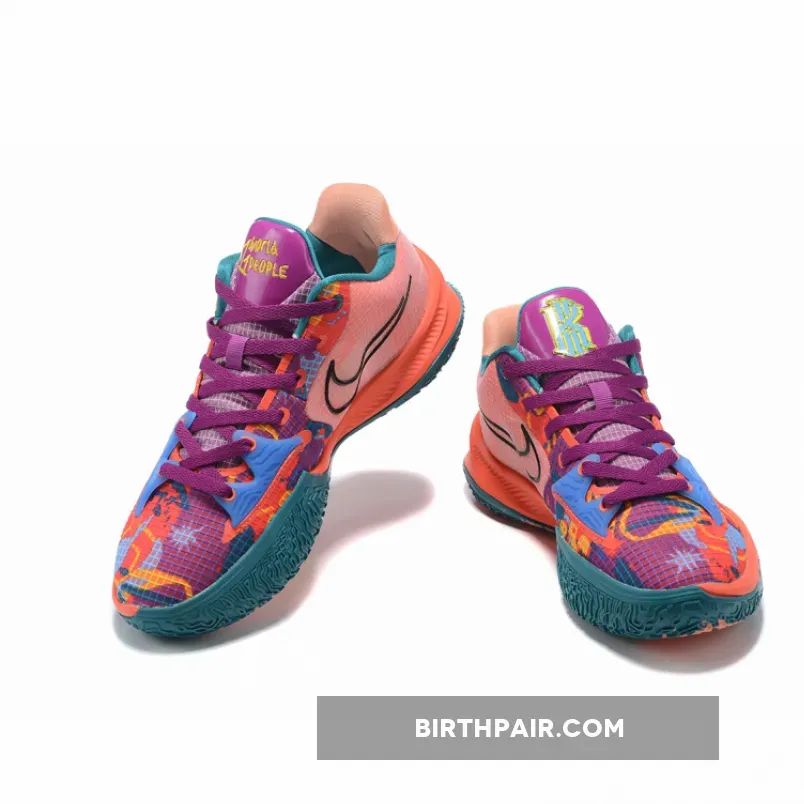 This eye-catching Nike Kyrie Low 4 “1 World 1 People” takes on a predominantly peach base with complementing hues of bright yellow, electric blue, and purple form abstract graphics on the toe box and eyestay areas. In terms of branding, black outlined Swooshes are spotlighted on both the medial and lateral walls, while Irving’s insignia is featured on the tongue and insoles. Lastly, “1 World 1 People” is branded on the right tongue