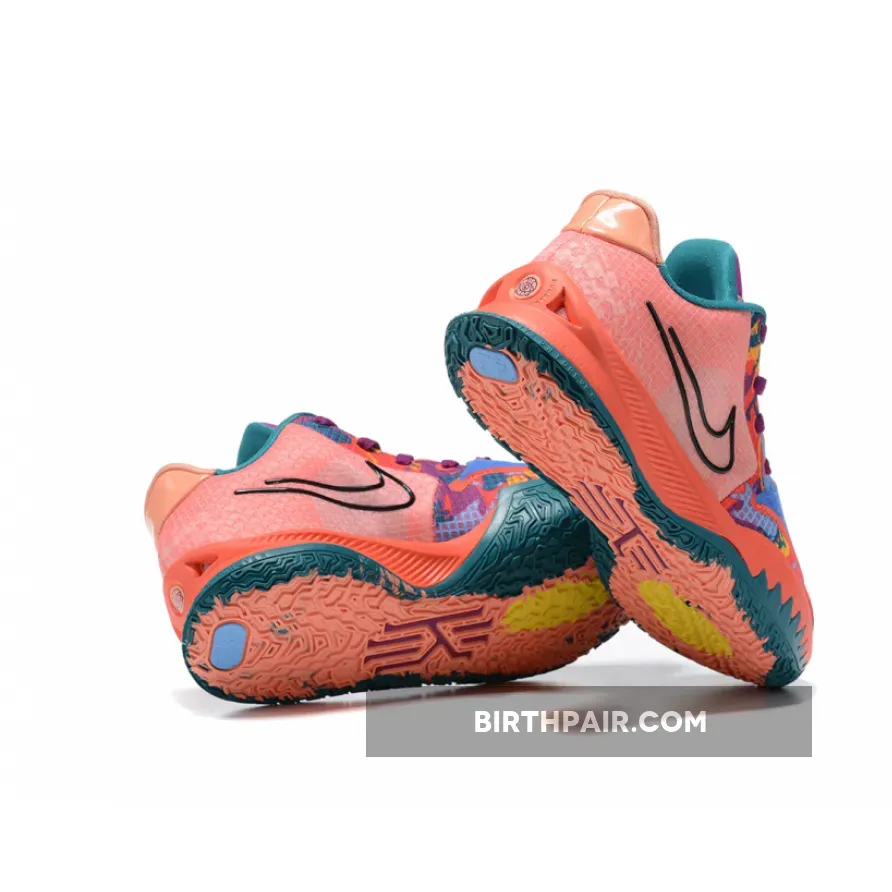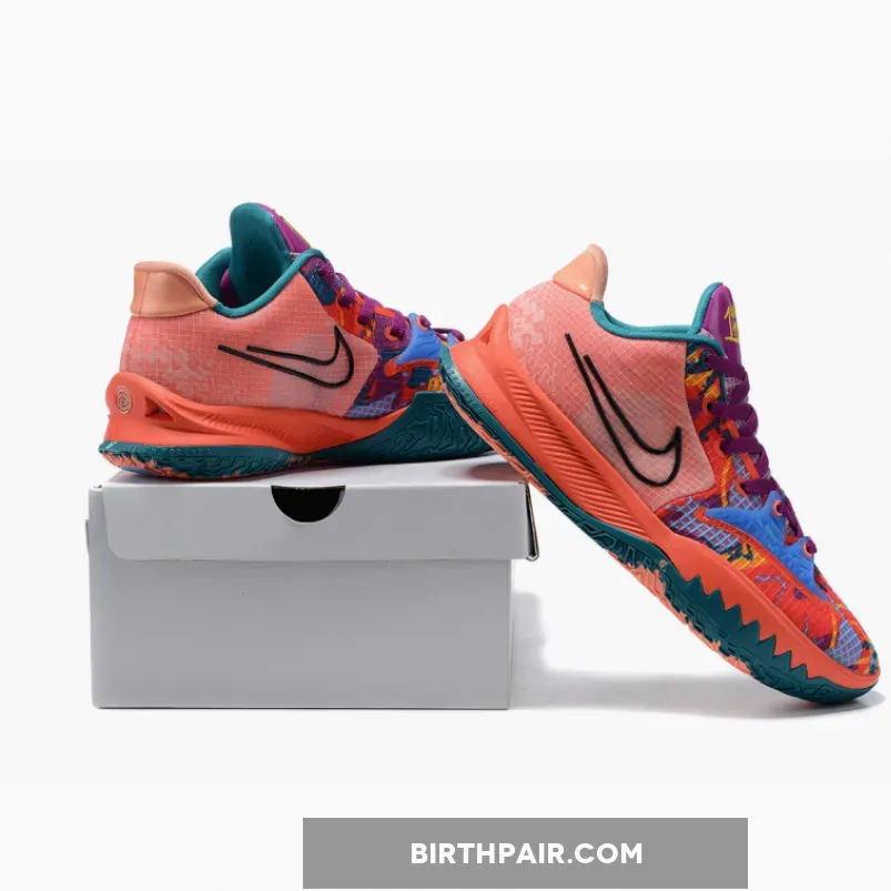 This offering of the Nike Kyrie Low 4 comes dressed in a Peach-like color blocking detailed with colorful graphics covering the toe area and up the eyestays. Other details includes Black outlined Swooshes on the sides, Blue and Teal contrasting accents with Maroon laces and tongues. “1 World 1 People” is branded on the right tongue that also comes with a stencil pack in a special edition branded shoe box.