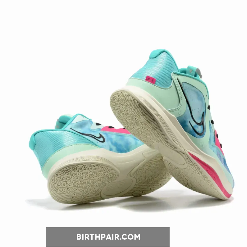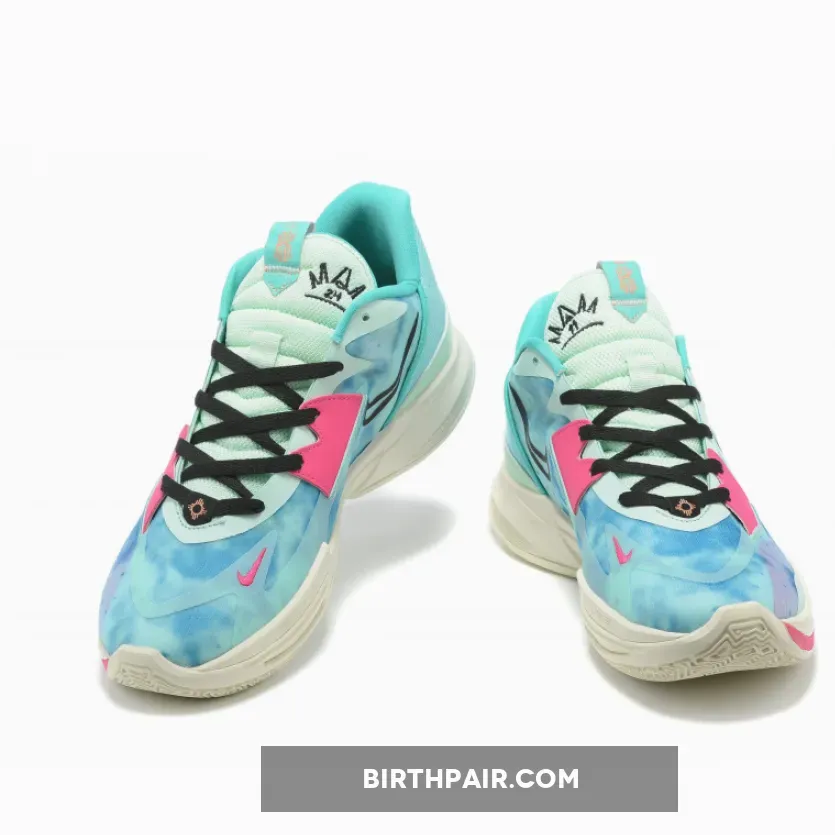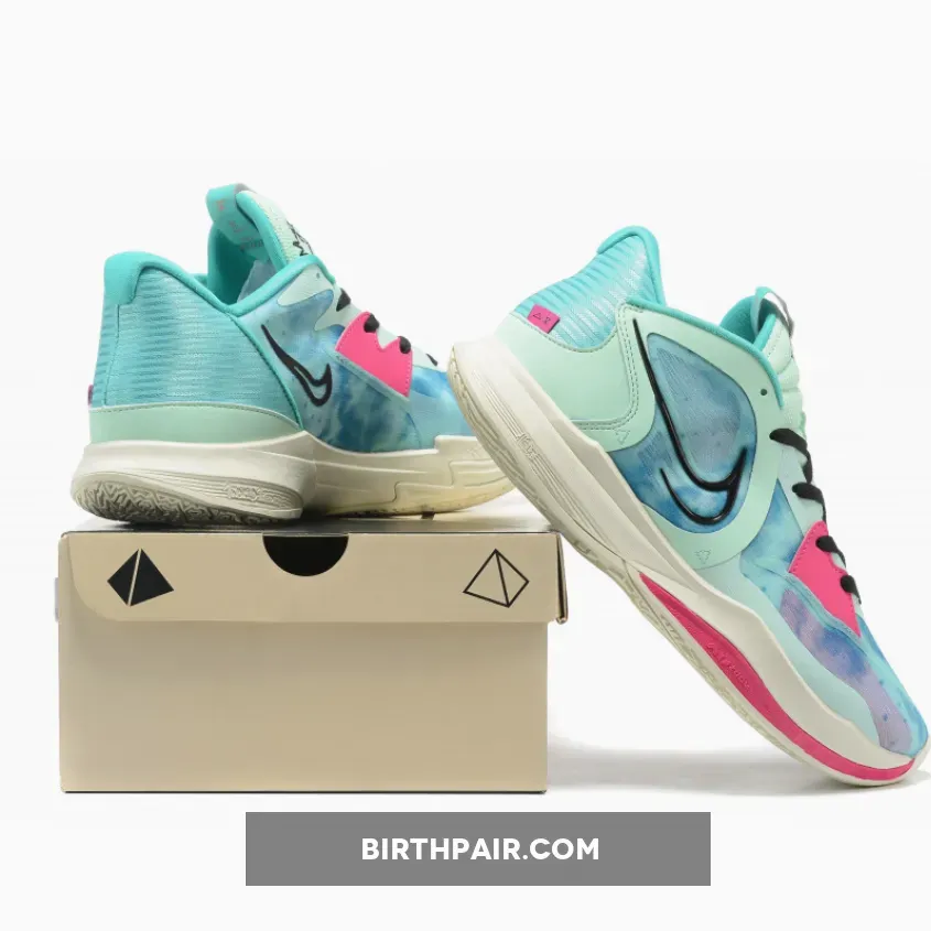This Nike Kyrie Low 5 has a washed blue upper that nearly has a tie-dye appearance. The pair contains many unique, creative details, embroidered with “Kings” and “Queens” on the interior. Along the outside, various blue hues mix for a watercolour-esque print, which runs beneath solid-toned blues and seldom hits pink. The signature Nike Swoosh is a silhouette outline in black, which suits the shoelaces.
