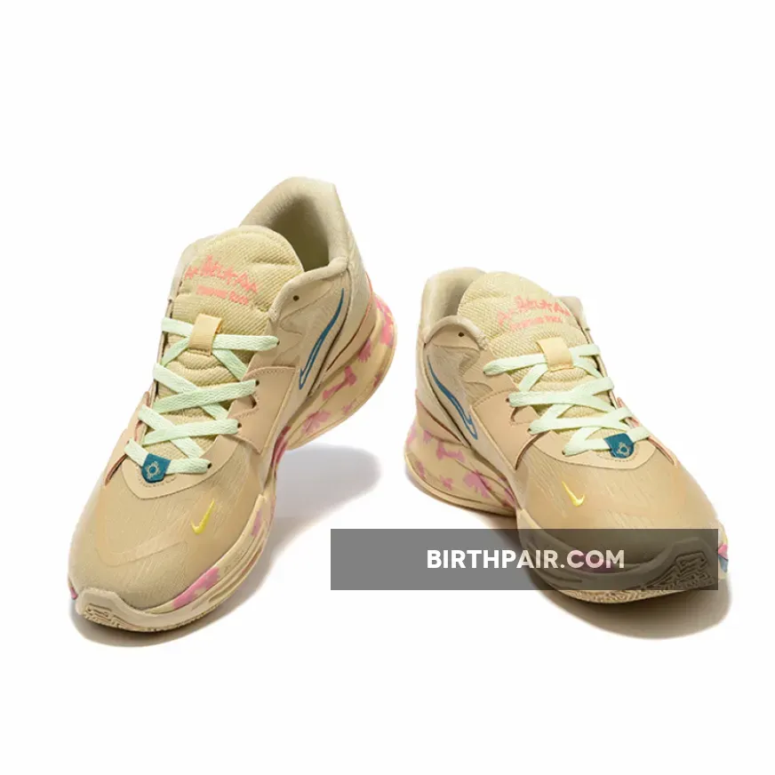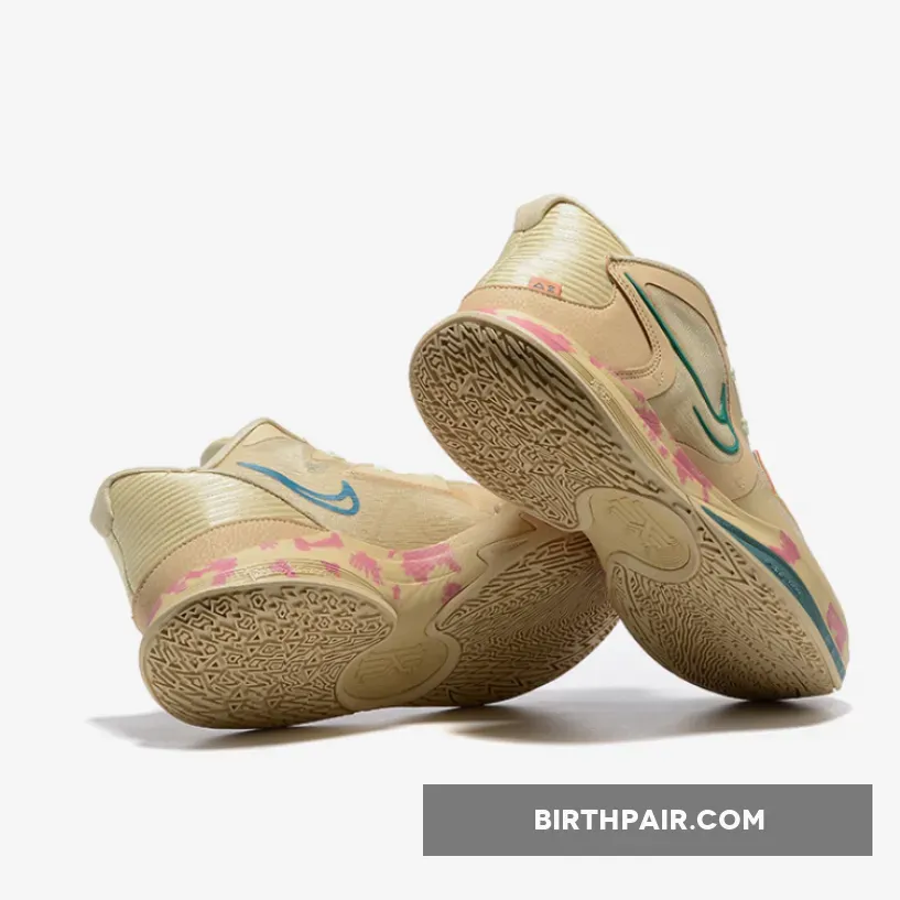 The Kyrie’s comes dressed in traditional colors tones using a tan hue as a base, Nike adds a signature Nike N7 logo appearing on both the insoles in green and the Swooshes. It highlights a mauve palette that also includes light turquoise and mossy yellow. Additional details include a marble-like pattern that appears at the midsole to complete the look.