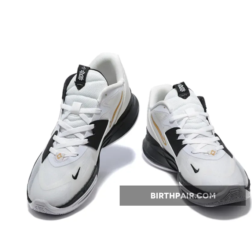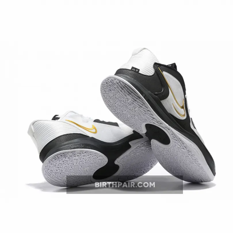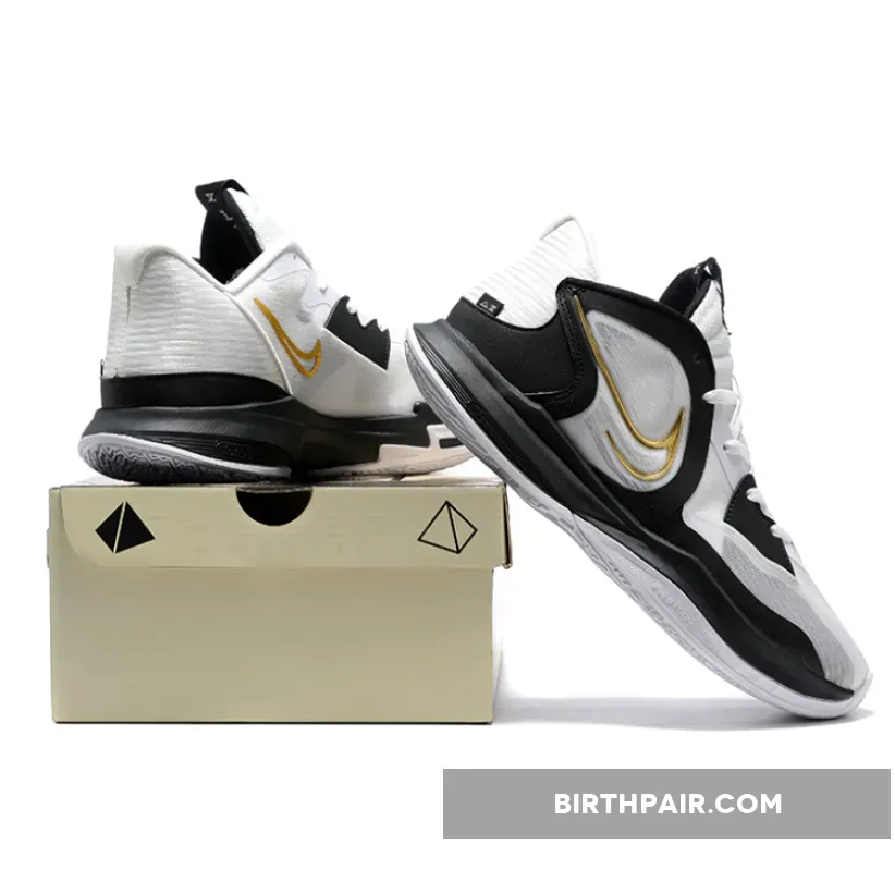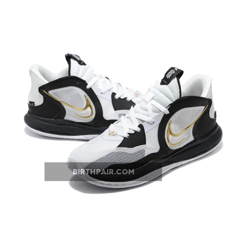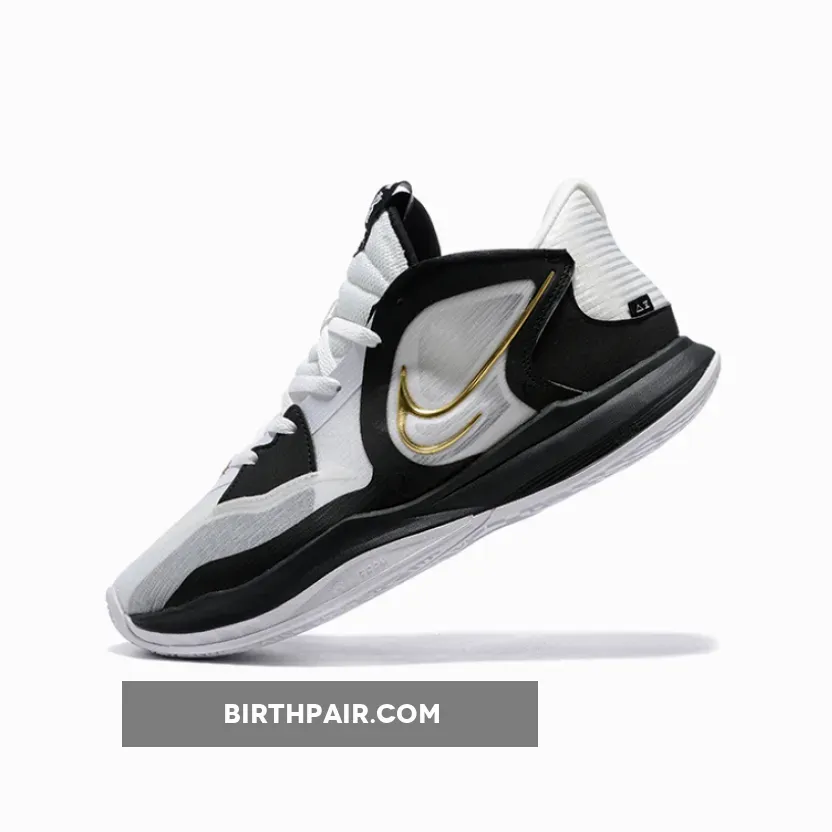 The Ben Nethongkome-designed Nike Kyrie 5 has a regal new release that’s bound to match anything in your closet. Meet the Nike Kyrie 5 Low White Metallic Gold Black. This Kyrie 5 sports an asymmetrical look with a combination of mesh, synthetic and pebbled leather material. The slanted white mesh tongues sport black piping and mismatched “K” branding on the tongues, one pyramid is white while the other is black. The Fly-trap mechanism that locks down this shoe is in black and white. Golden and stylised Swooshes cover both the medial and lateral sides of the shoe.