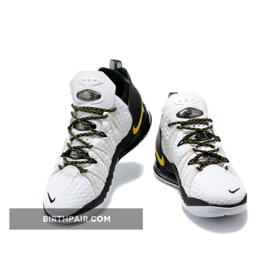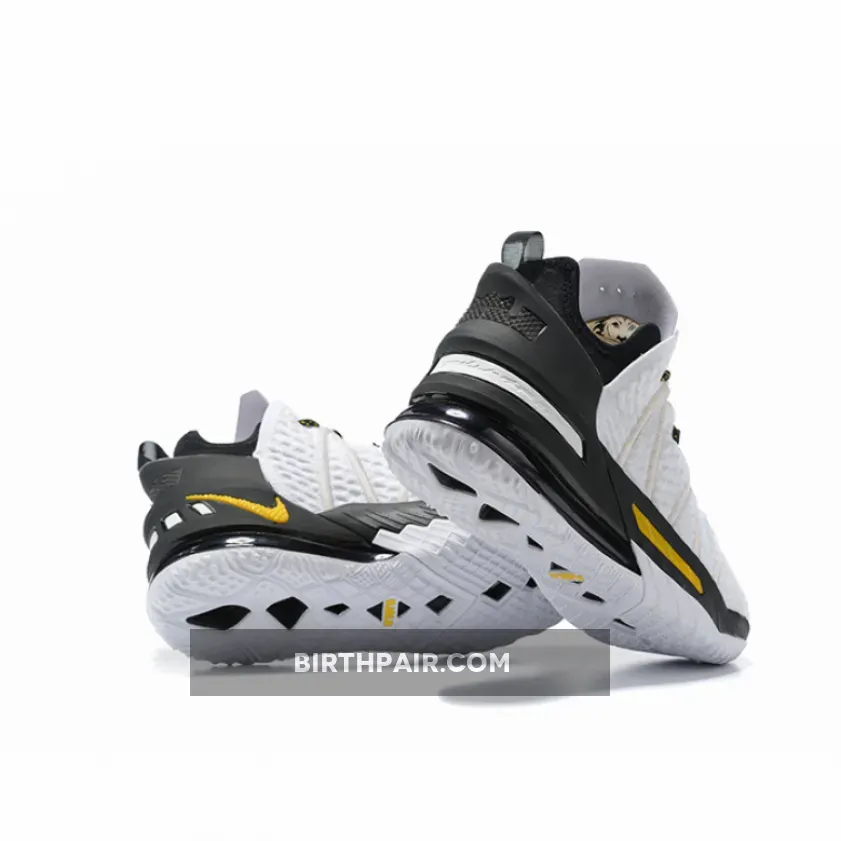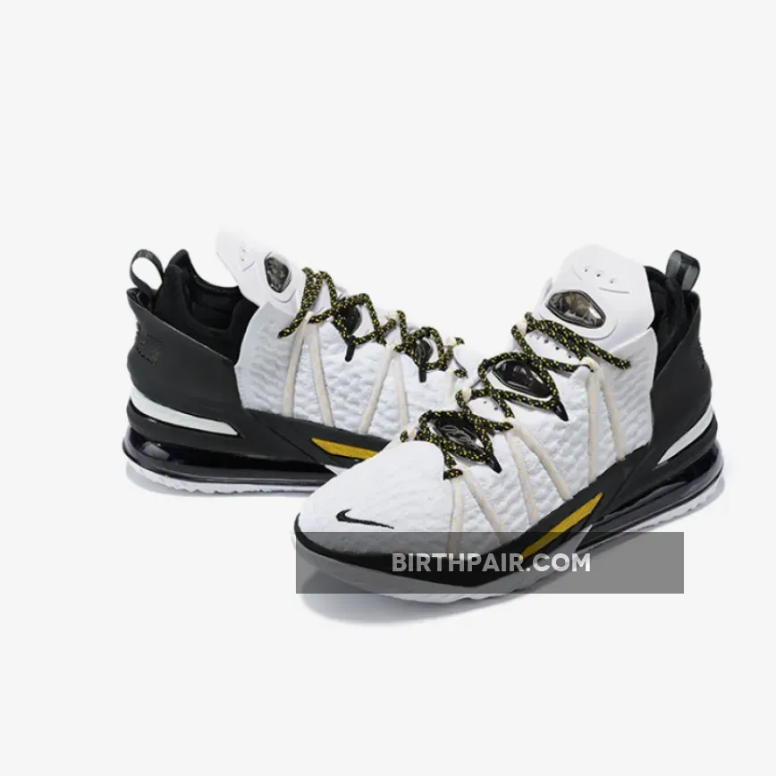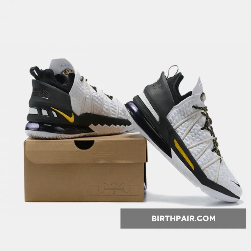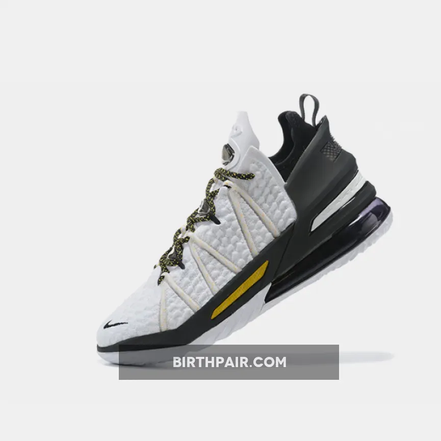 this Nike LeBron 18 features a White, Amarillo, and Black color combination. First, the pair features White knitting across the upper while Black and Gold accents run throughout. Next, LeBron’s number ’23’ lands on the insoles in the same style as his Lakers jersey while speckled accents land on the laces.