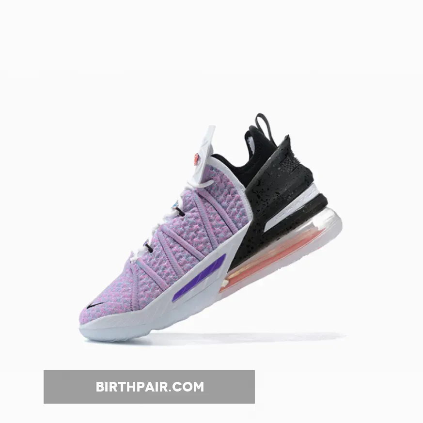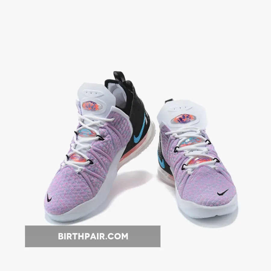 This edition of the Nike LeBron 18 features a mix of Purple, Pink, and Blue hues covering its Flyknit upper paired with White tongues, laces, and midsole. Black covers the heels and mini embroidered Swooshes on the toe along with a Chlorine Blue Swoosh on the medial heel. Finishing touches includes graffiti print appearing on the “JAMES GANG” text insoles atop a translucent outsole.