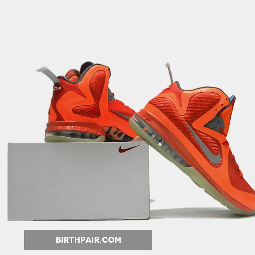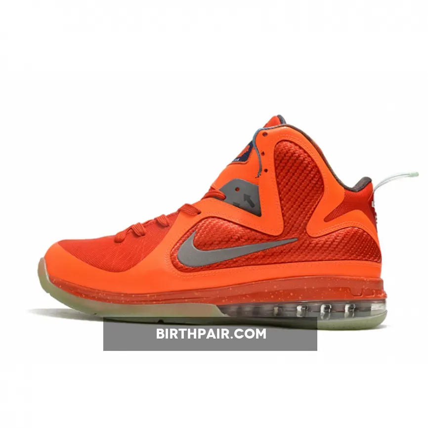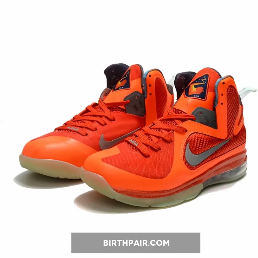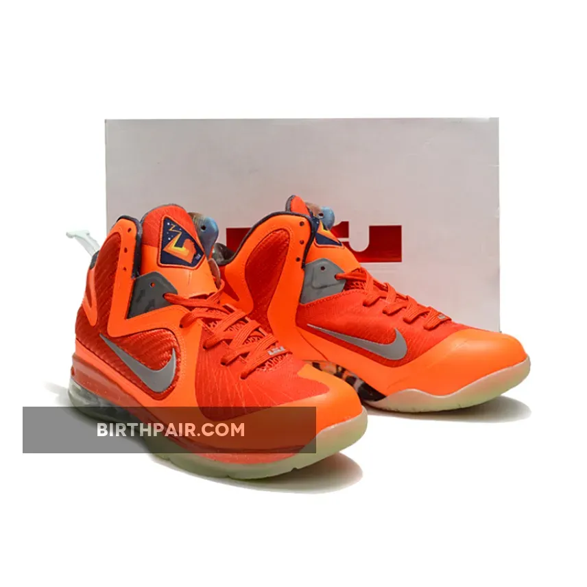 Dressed in a Total Orange, Metallic Silver, Team Orange, and Mango color scheme. This Galaxy-themed Nike LeBron 9 features Orange hues throughout its mesh upper while having 3M Swoosh logos.