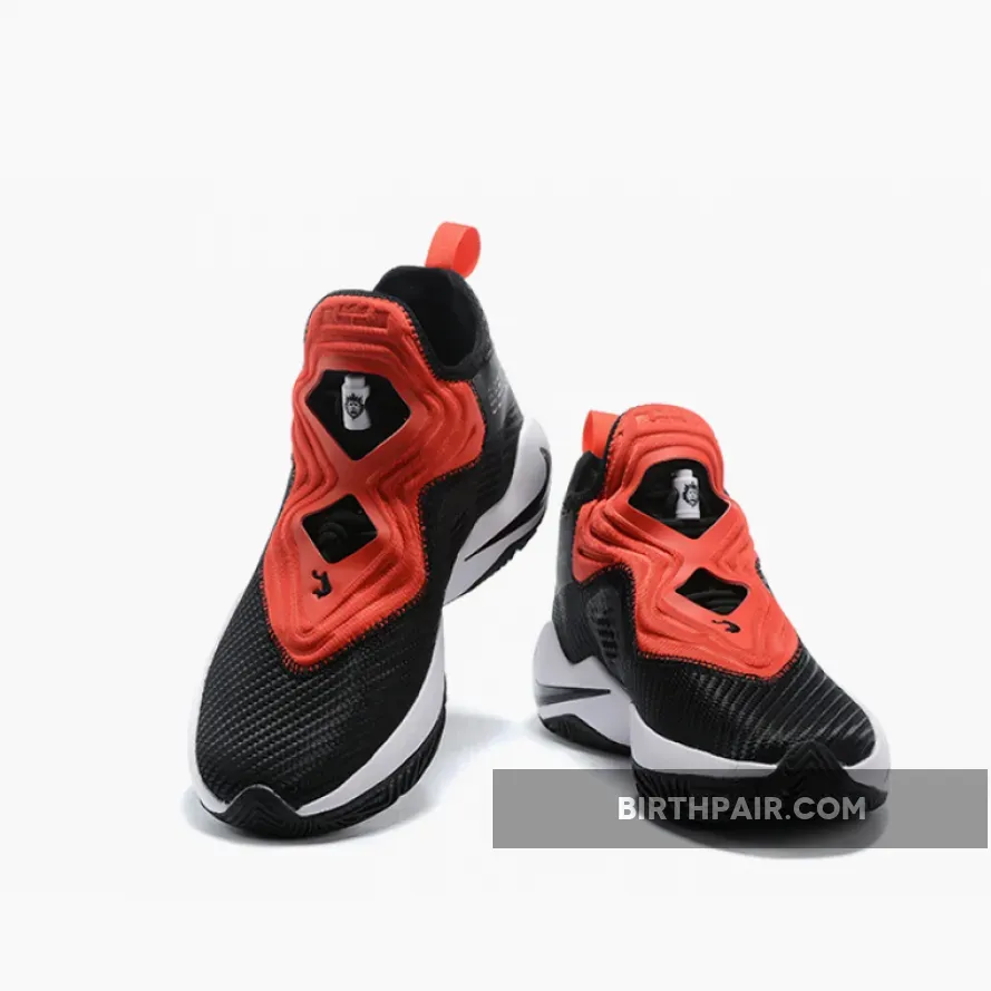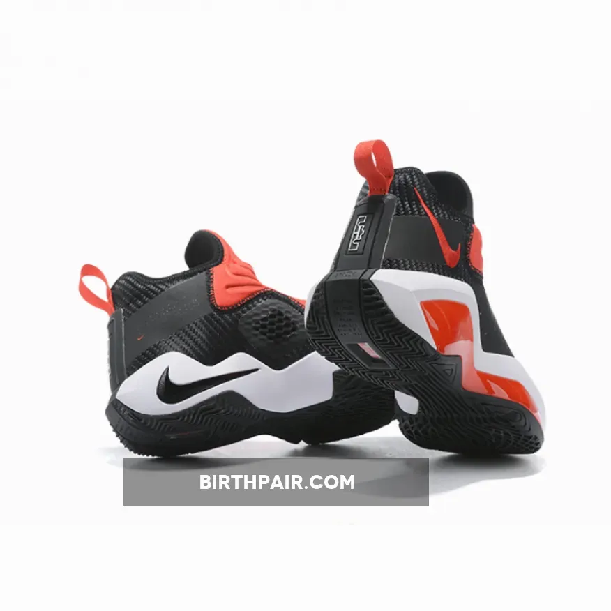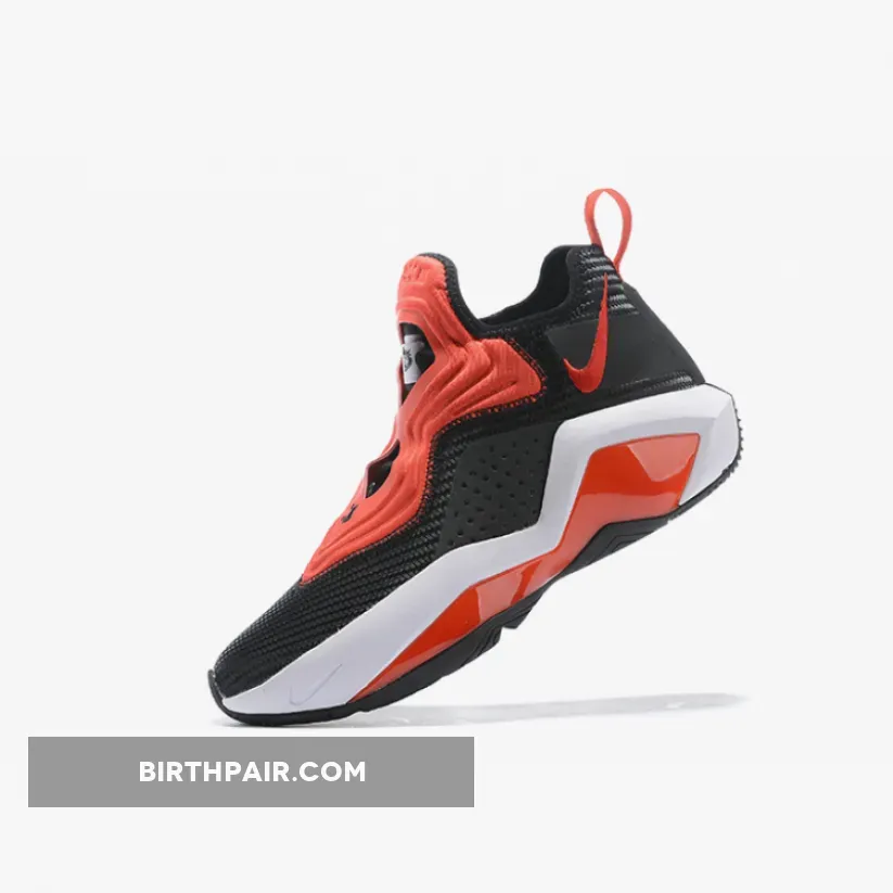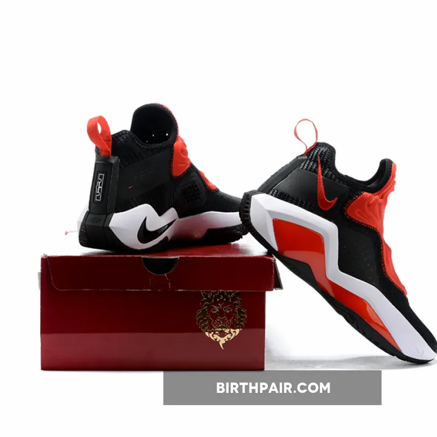 Dressed in a Black, University Red, and White color scheme. This LeBron Soldier 14 features a Black mesh upper with perforated overlays on the sides.