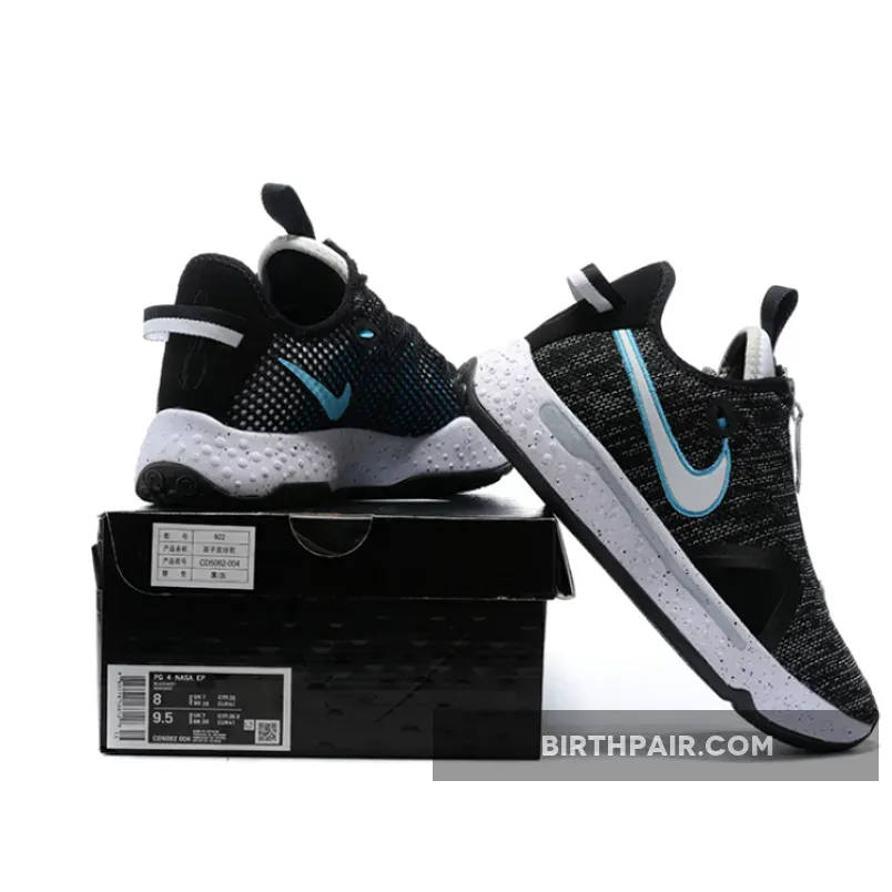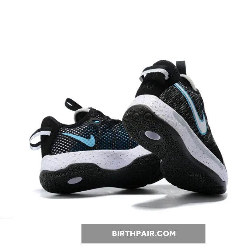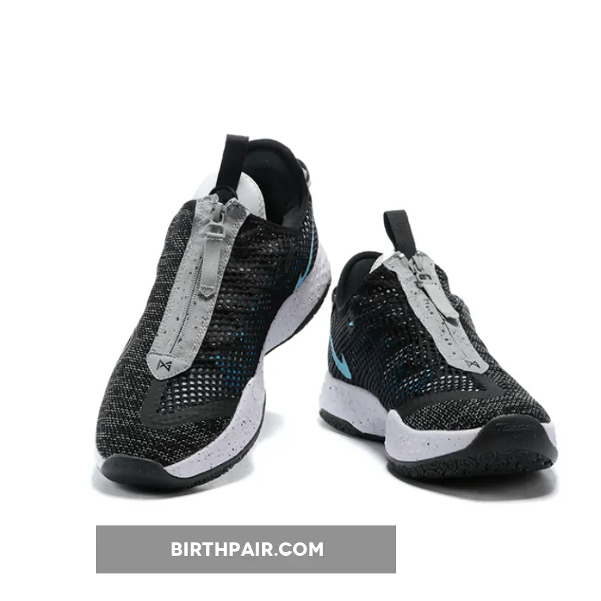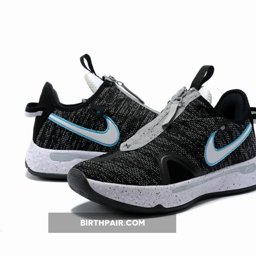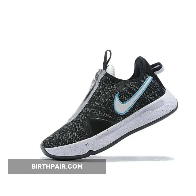 Dressed in a combination of Black, Grey, Blue, and White colors. This PG 4 features a knitted heathered upper with White Swooshes on the sides outlined in Blue.