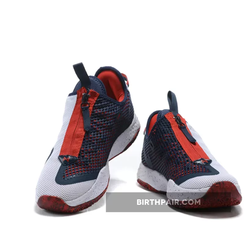 This offering of the Nike PG 4 features a White mesh upper paired with a semi-translucent Navy panel on the medial side, while Red accents covers the zipper, midfoot and sock liner. A speckled midsole atop a Red/Blue marbled outsole completes the design.