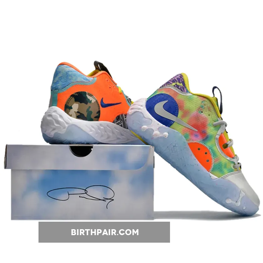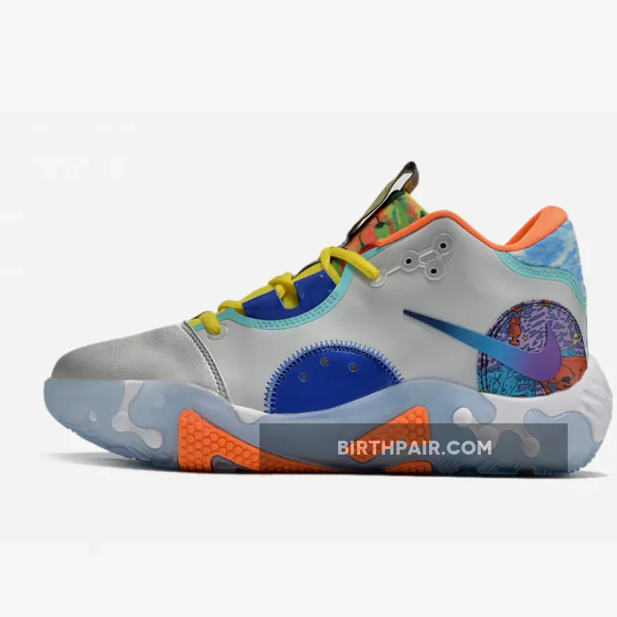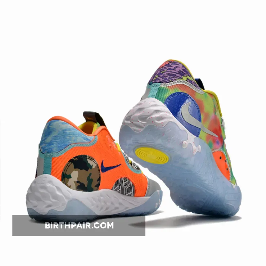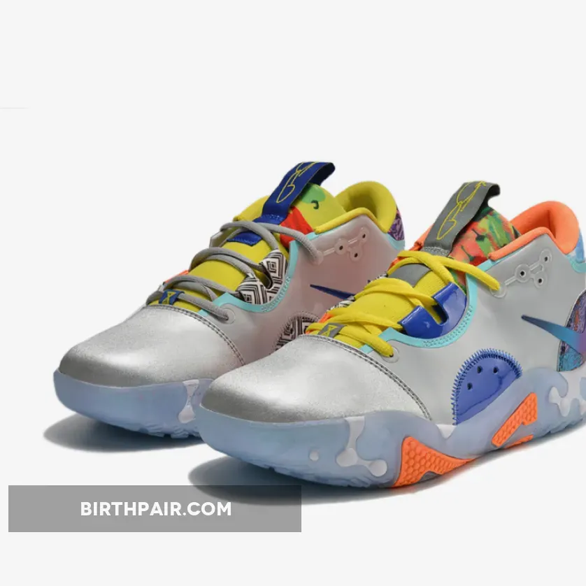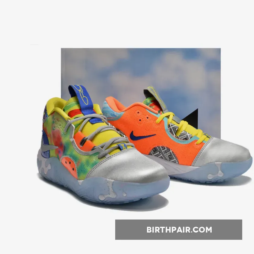 This Nike PG 6 features an Opti Yellow, Metallic Silver, and Total Orange colorway that gives this pair ‘What The’ vibes. Furthermore, the pair will feature a mixture of patterns and prints, while Silver drapes the toe and White adorns the panels. Other details include speckled detailing, a React foam sole, and a translucent outsole.