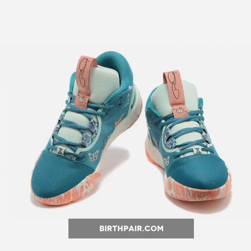 This Nike PG 6 features Dark Green on the base while Pink appears on the tongue pull tabs, backward Swoosh, and blotched across the midsole. Throughout, we have butterflies and floral prints while a basketball with an arrow through it adorns the tongue. On the left insole, we have a cupid, while the right features a basketball hoop, basketball, and heart that finishes the look.