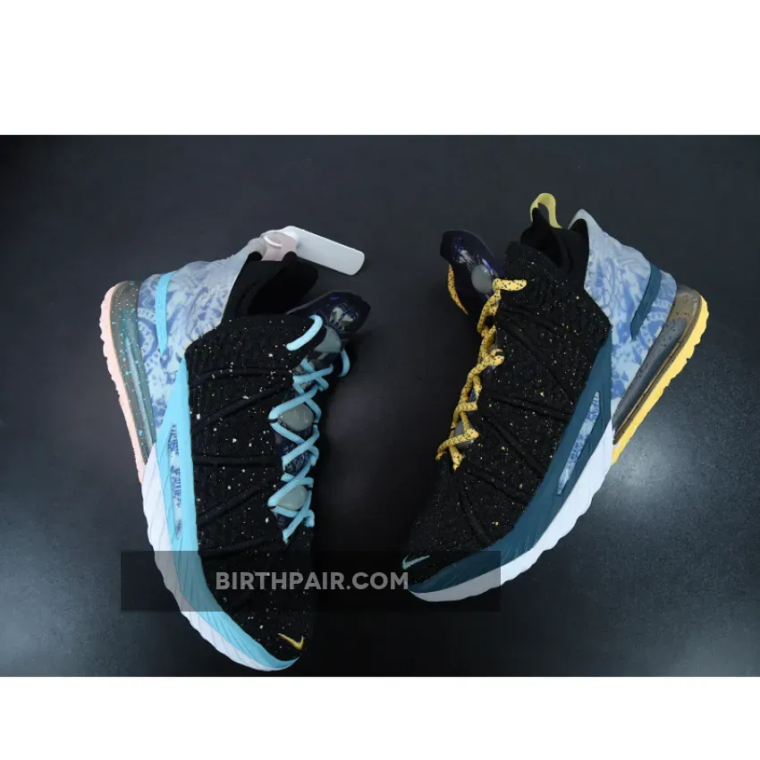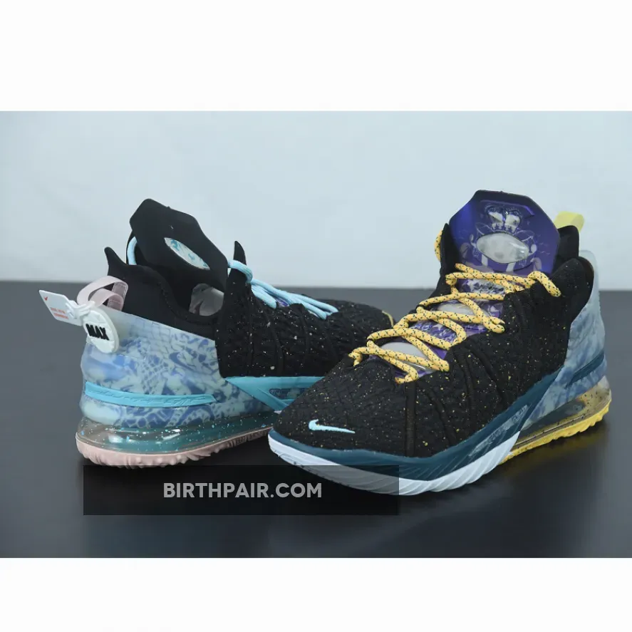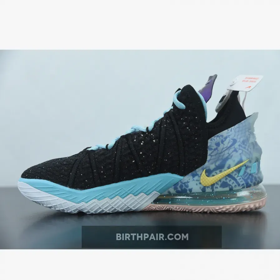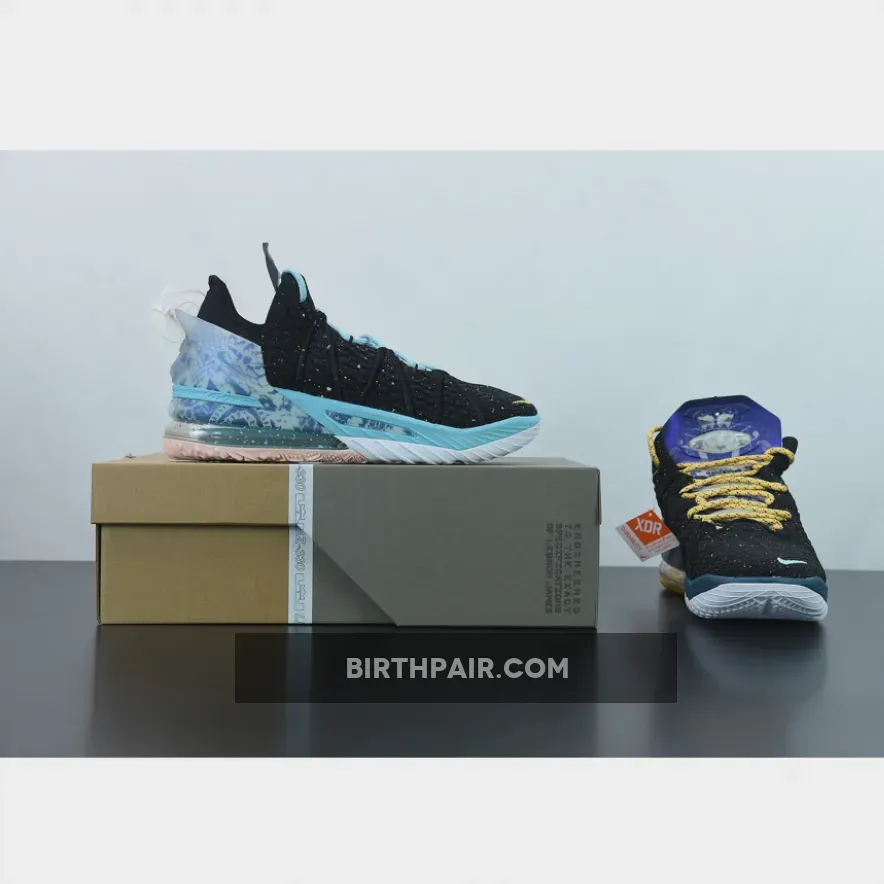 The reflection theme is expressed through slightly altered colors on the left and right shoe, with variations on the sole, logos, heel tab and laces. Iconography representing his 17 seasons to date creates unique collages that appear as graphics on the heel, tongue and sockliner. With a lightweight black Knitposite 2.0 upper, durable molded heel clip, new Air system in the tongue and a full-length Air Zoom unit combined with a Max AIR unit in the heel, this game-changing design elevates the LeBron signature line to the next level.