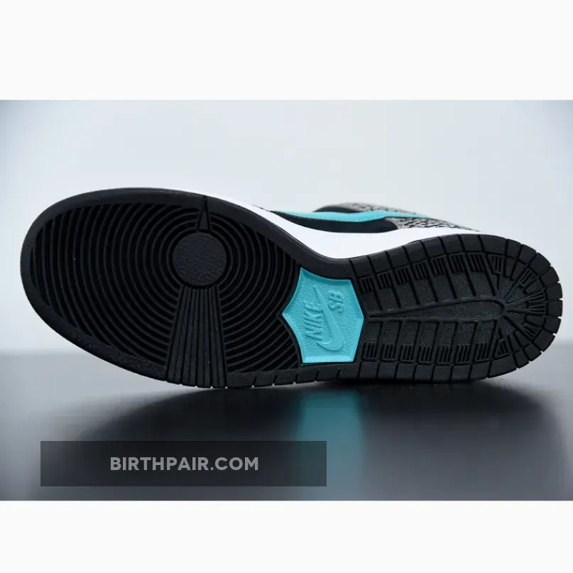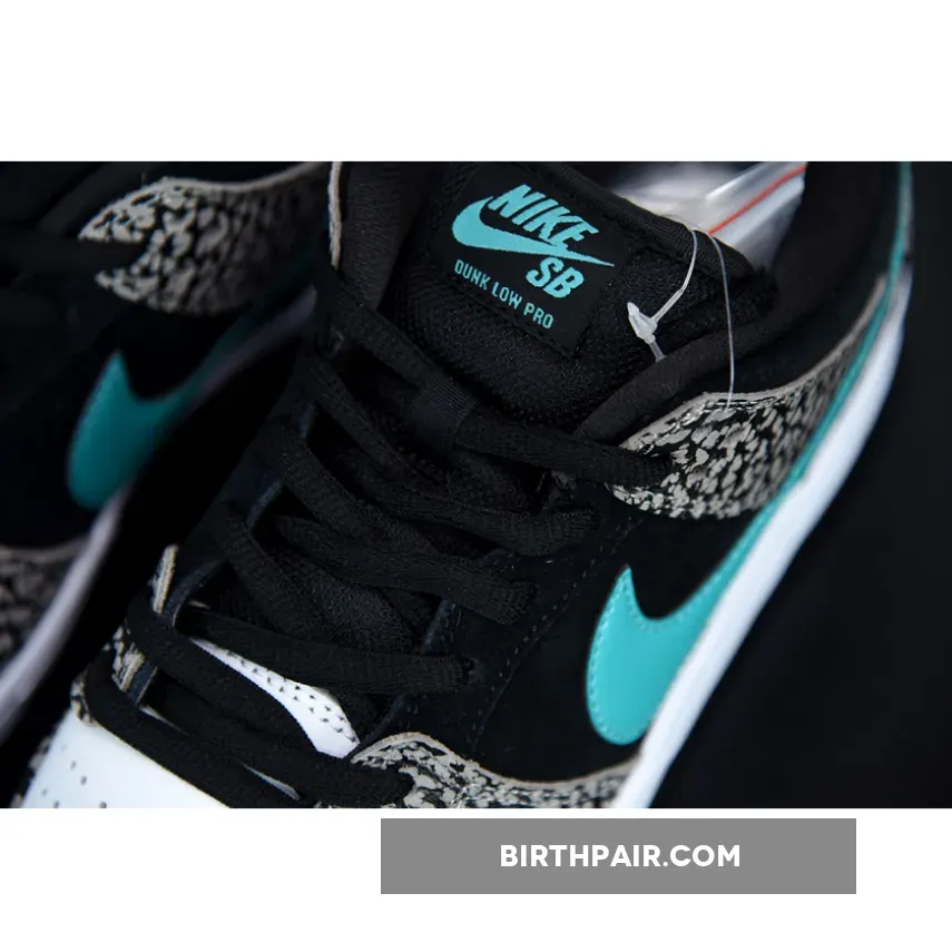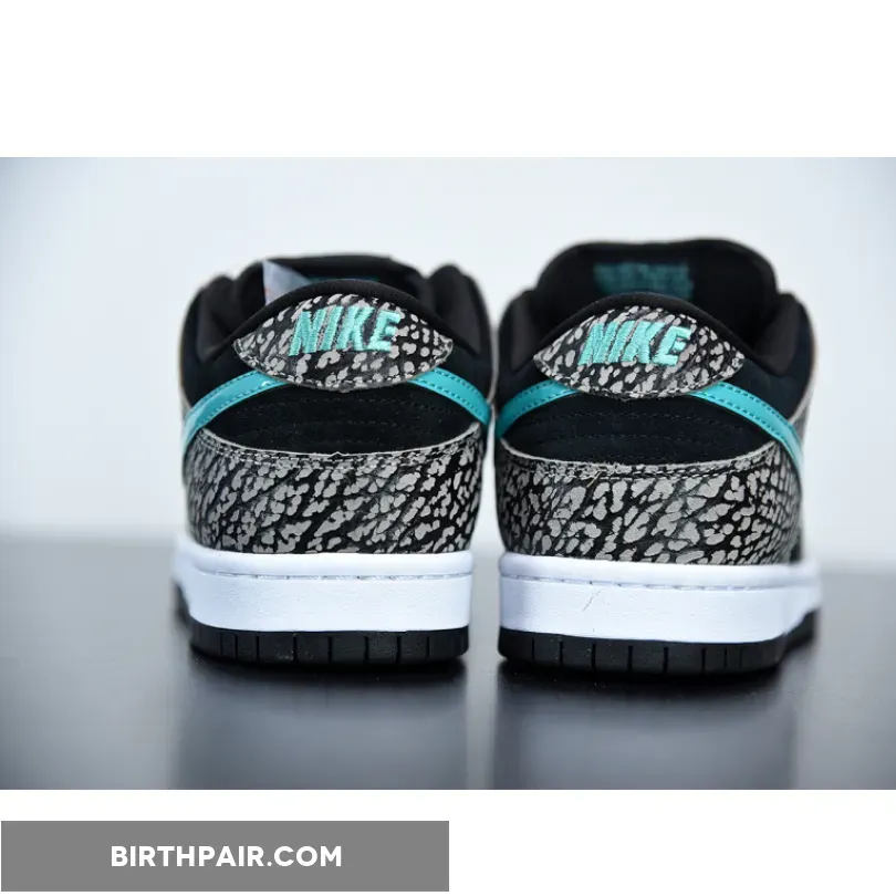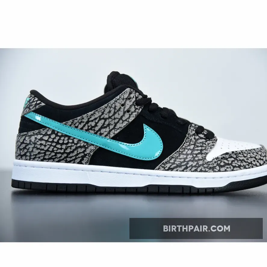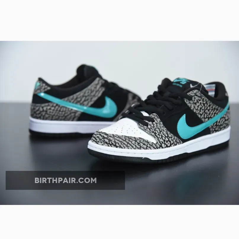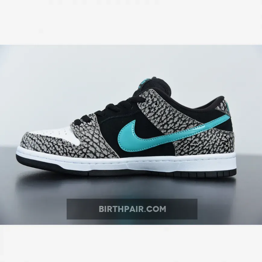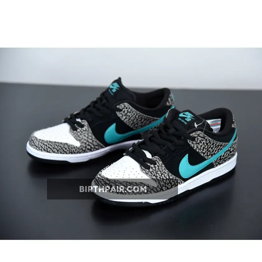 The Nike SB Dunk Low atmos Elephant features a white leather and black nubuck upper with Cement Grey Elephant print overlays and a Clear Jade Swoosh. A padded SB tongue, Elephant print heel tab with Nike embroidery, white midsole, and black outsole complete the design.
