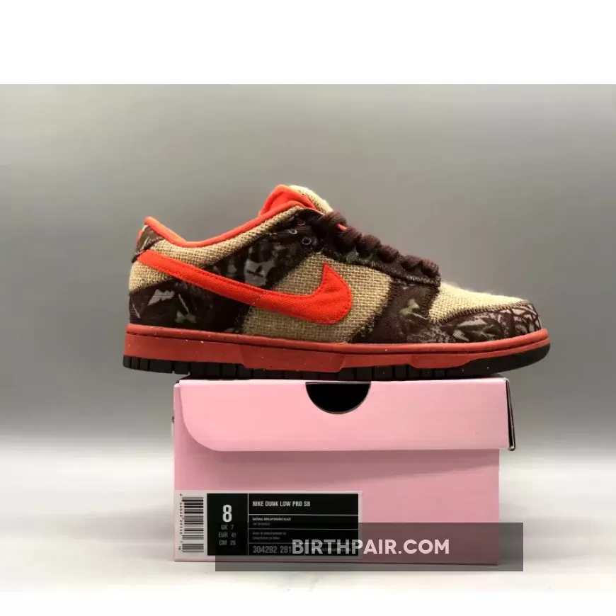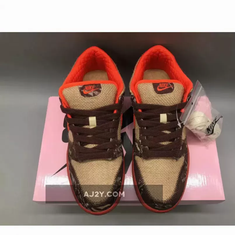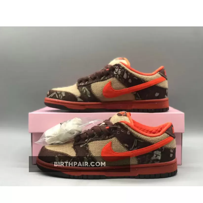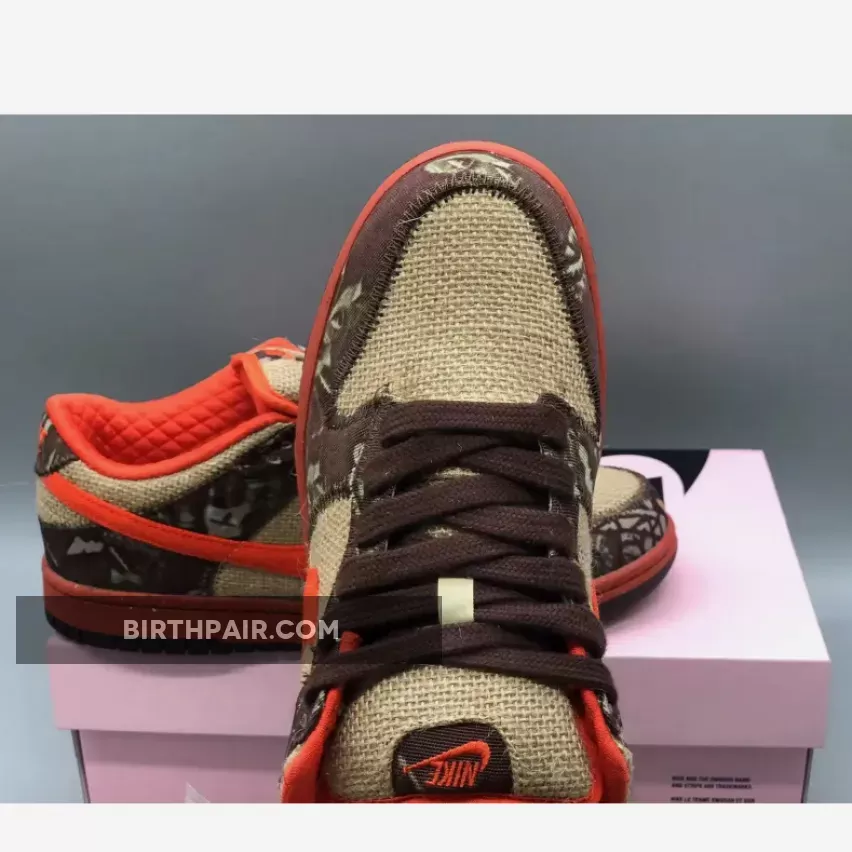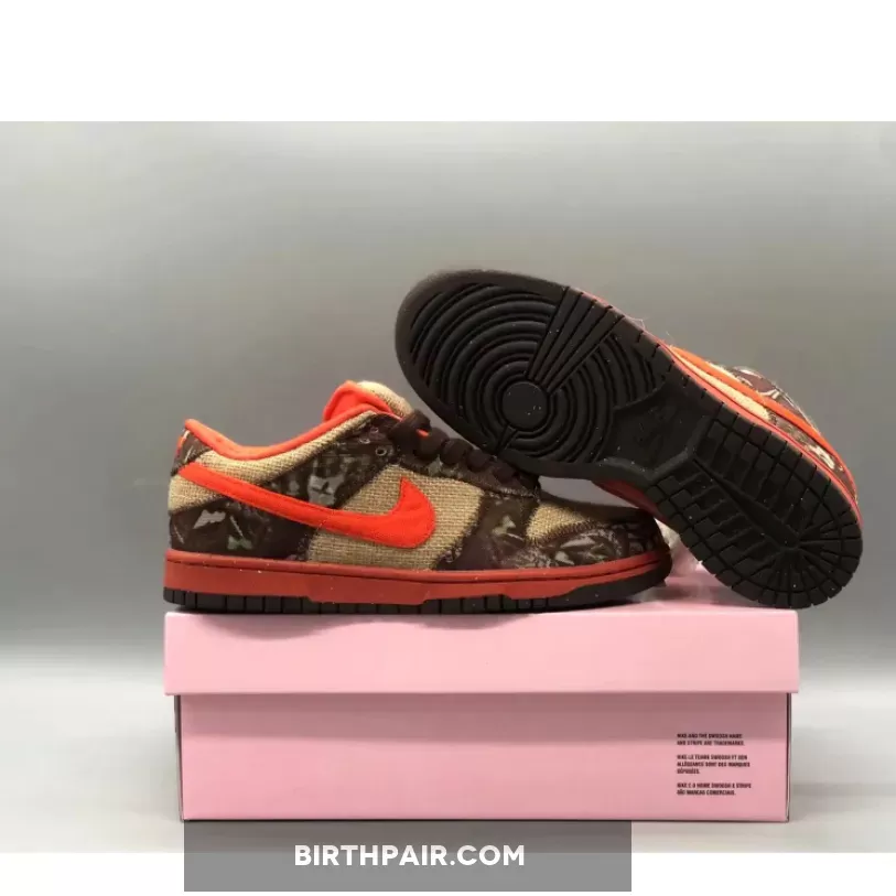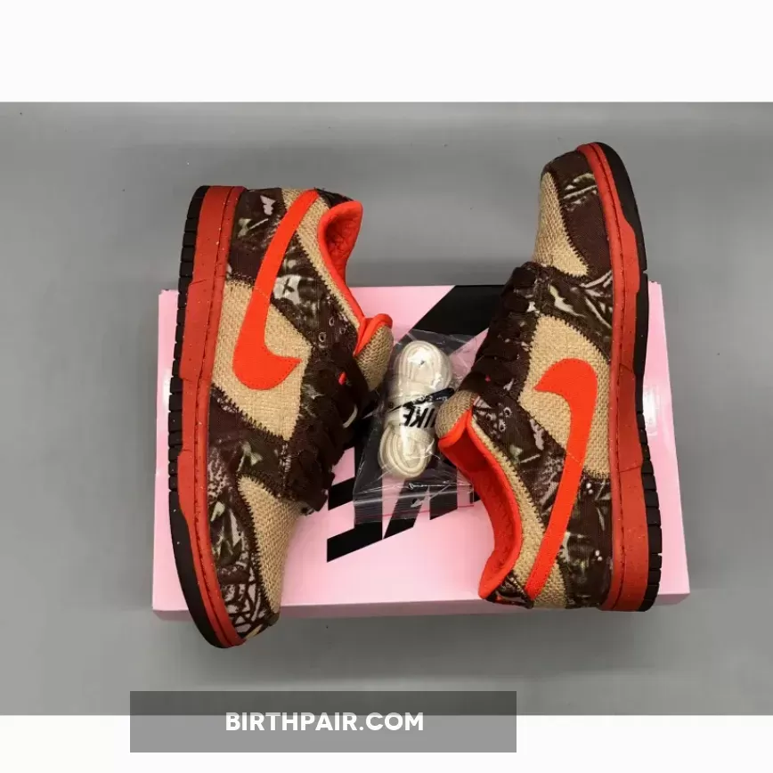 Hailing from the Nike SB Dunk’s beloved “Pink Box” era, the “Hunter” edition showcases a unique approach to Forbes’s skate shoe vision. It boasts a sturdy burlap base adorned with brown-and-white camouflage overlays. Adding a pop of color, an Orange Blaze canvas Swoosh graces both sides of the shoe, complemented by an orange quilted nylon interior lining. The design is punctuated with tonal zig-zag stitching on the overlays, amplifying its rugged charm.