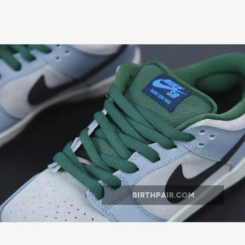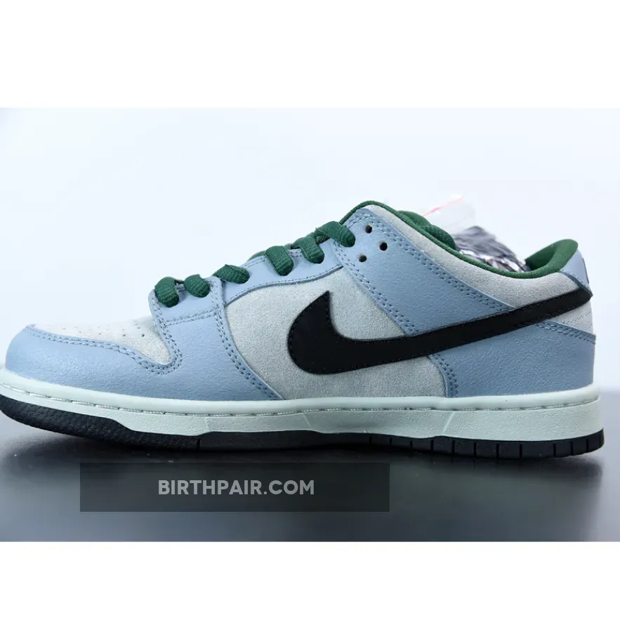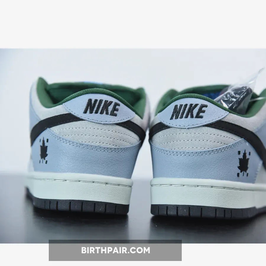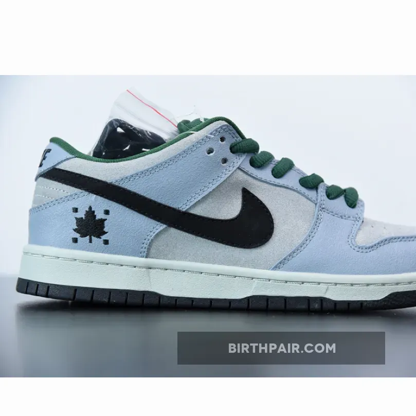 This Nike SB Dunk Low features a Dove Grey suede upper with Black detailing, minor hints of Blue on the tongue and Gorge Green accents. The shoe is also completed with a Maple Leaf embroidery on the heel.