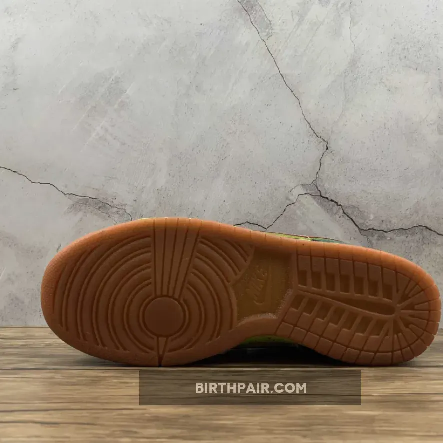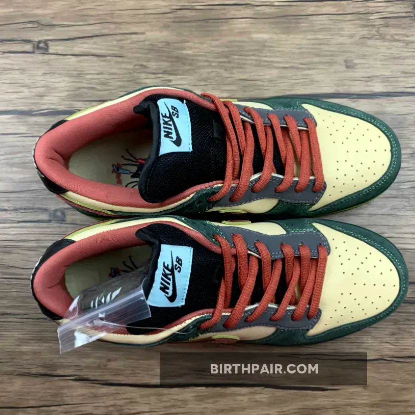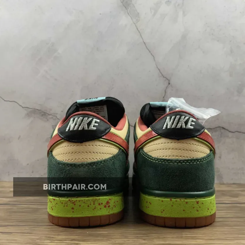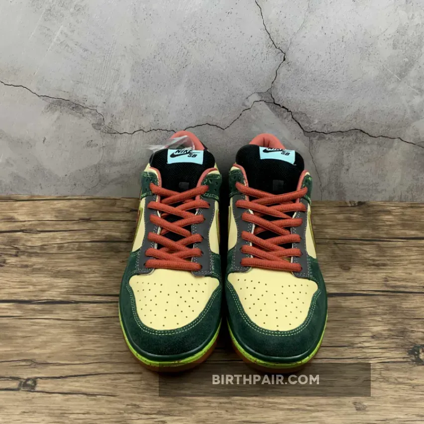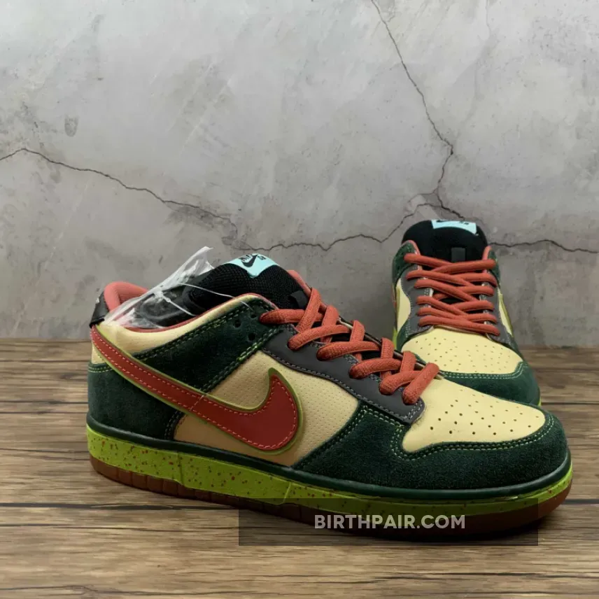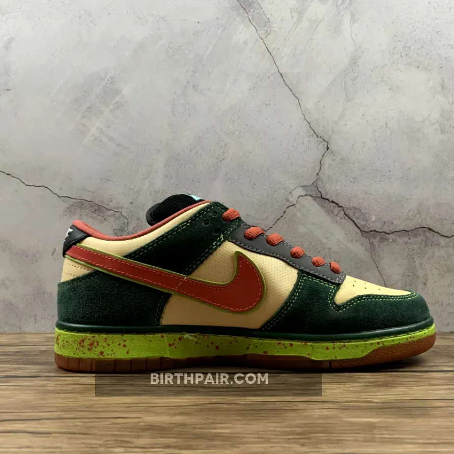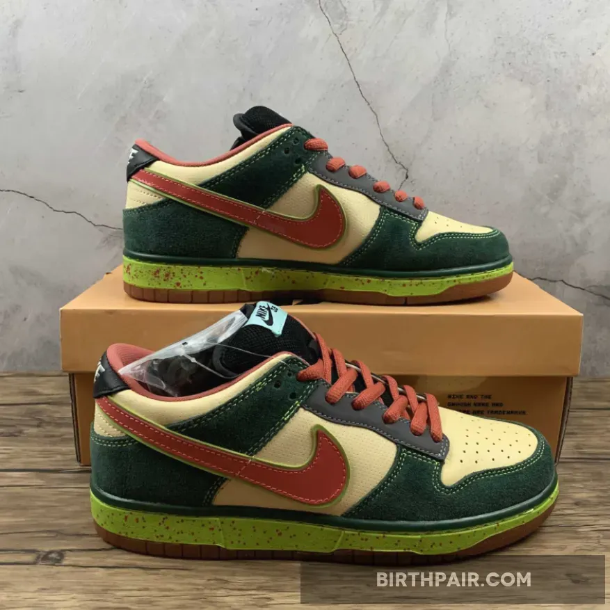 This mosquito inspired Nike Dunk Low Premium SB dropped in 2008. Its unique color blocking combines a smooth Vanilla leather base with green suede overlays, a vermilion patent leather on the Swoosh and black leather on the tongue, eyestay and heel patch.