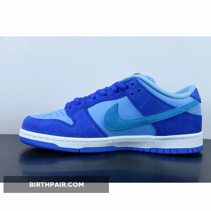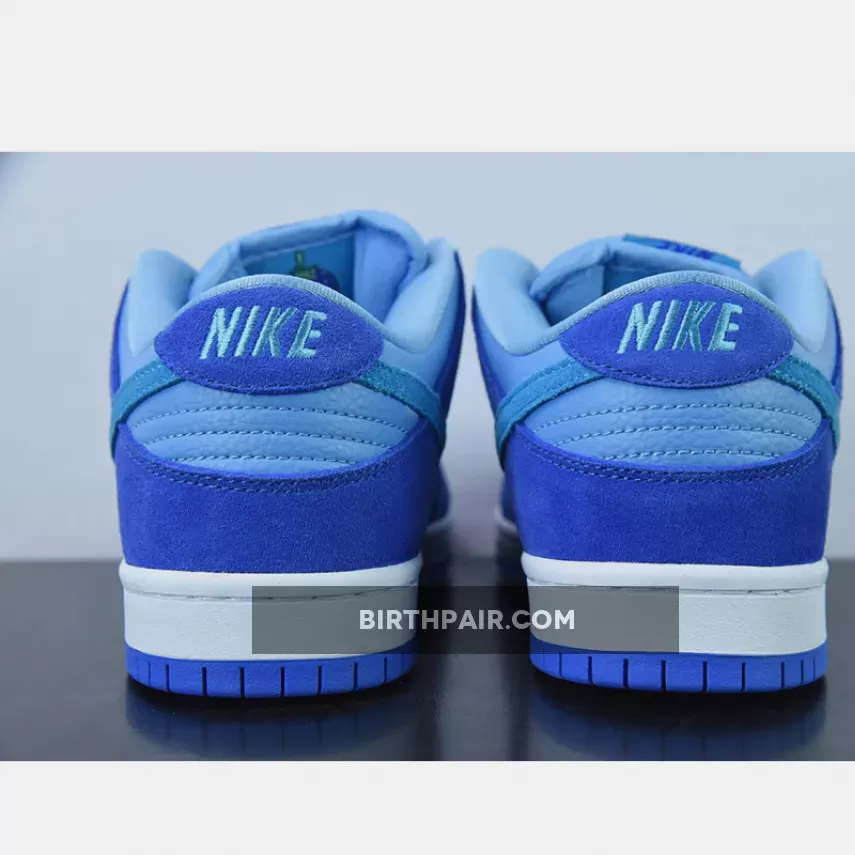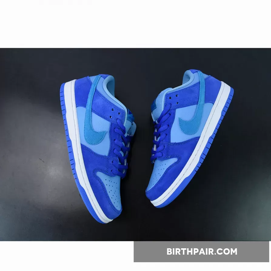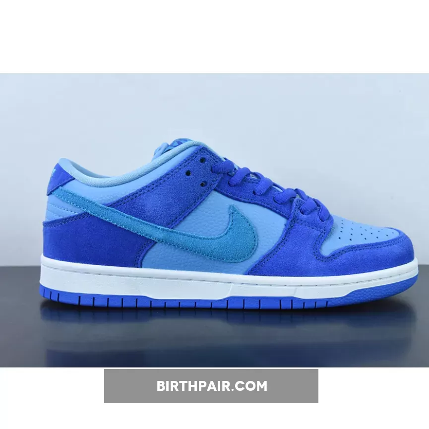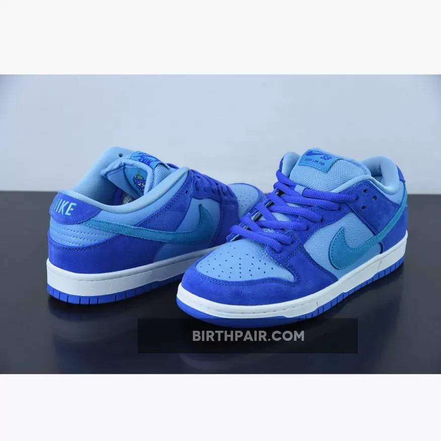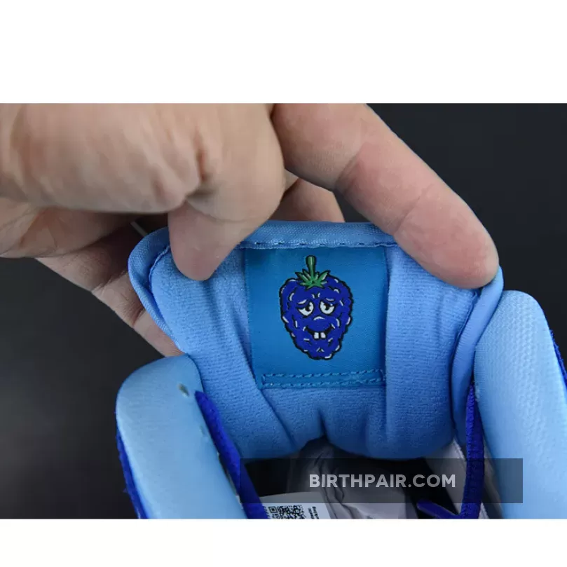 The Peter Moore-designed Nike SB Dunk Low has a brand new collection, the “Fruity Pack”. One of its delicious iterations is the Nike SB Dunk Low Fruity Pack Blue Raspberry.The base of the upper is a light University Blue in tumbled leather, showing on the perforated toe box, the mid-panel and the heel. The overlays are in a darker Racer Blue in suede on the toe cap, the mudguard, the eye stay panel and the collar-to-heel-counter panel. The signature profile Swooshes in suede are in a contrasting Racer Blue on the medial and lateral sides of the shoe. The mesh tongue in University Blue features Nike SB Dunk branding on the tongue tab and the fruit embroidered on the inner lining.