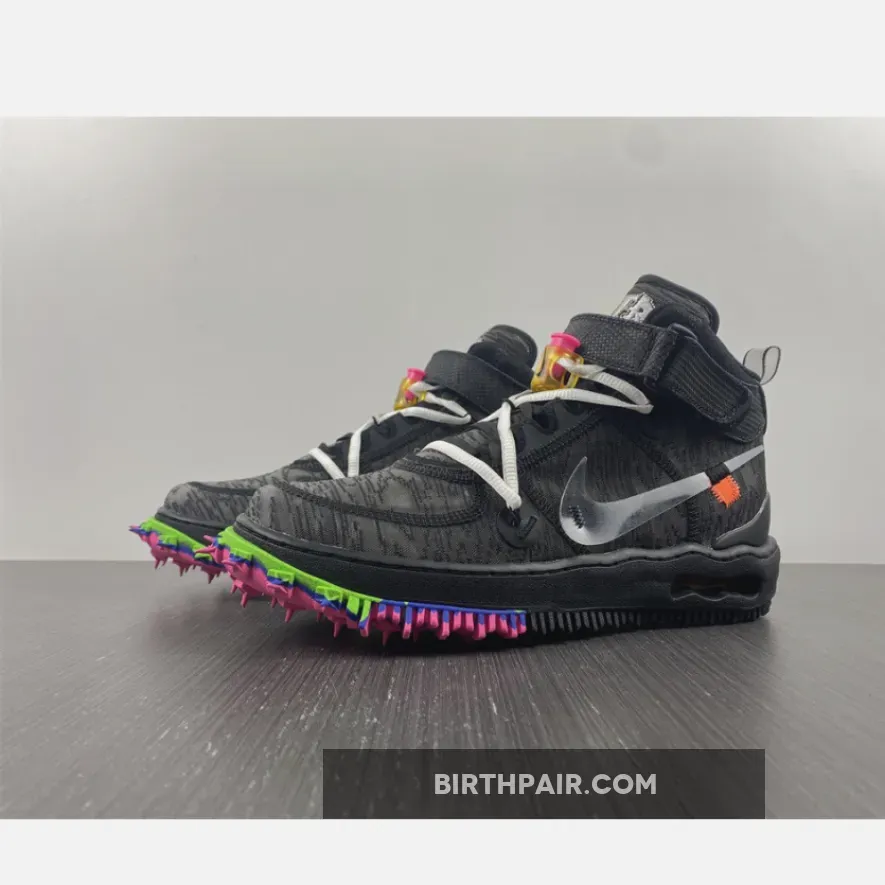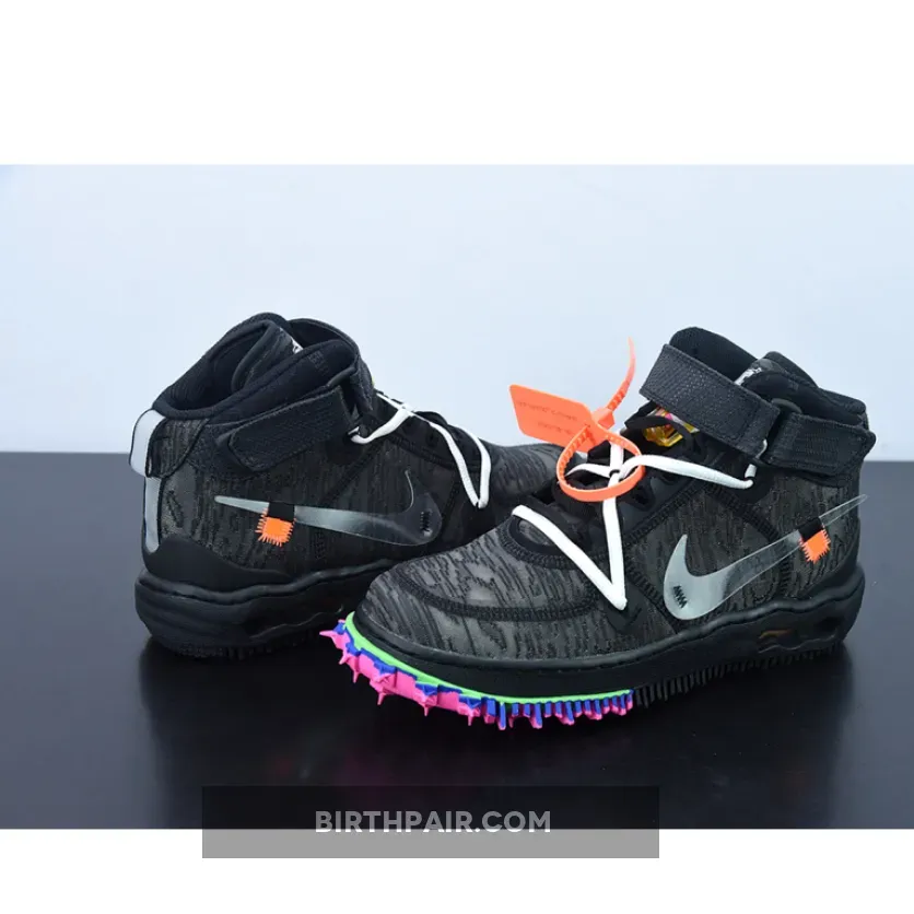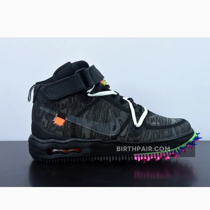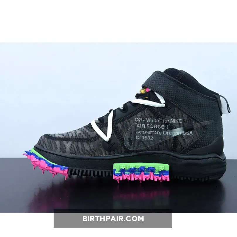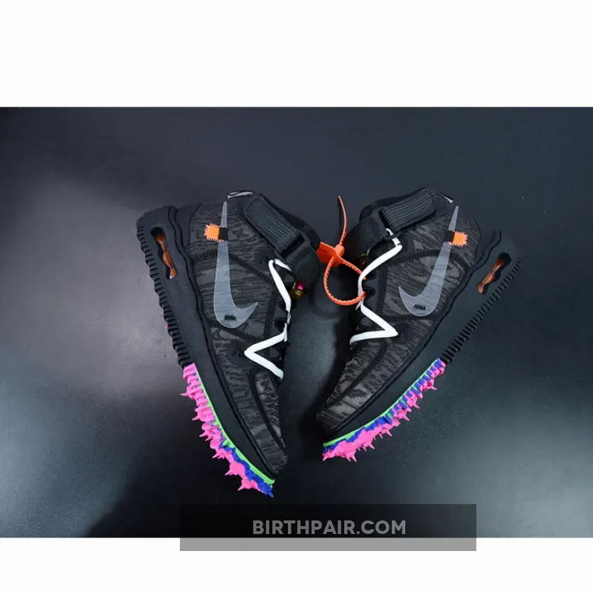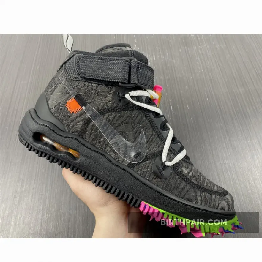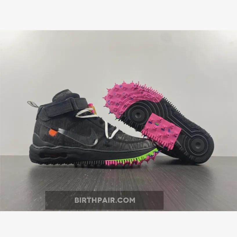 The Virgil Abloh-helmed Italian luxury fashion label, Off-White, and Nike Air Force 1 have a new iteration for their latest spiky collection, the Off-White x Air Force 1 Mid Black Pink. The semi-translucent upper features streaks of black knit details and reveals a white construction beneath. The black lockdown straps with a textured grid design wrap around the collar and are braced on the heel. The oversized profile Swooshes, accompanied by mismatched orange tabs, blend in with the upper with a completely transparent material. The signature Off-White Helvetica text in white is printed on the left medial side, underneath the Swoosh. The shoe also has a criss-crossed black and white lacing system punctuated by hot pink and translucent yellow lace toggles. A pure black midsole, housing Air units encased in bold orange, contrasts with the spiked tread in layers of royal blue, hot pink and vivid green, completing the outlandish look of the shoe.