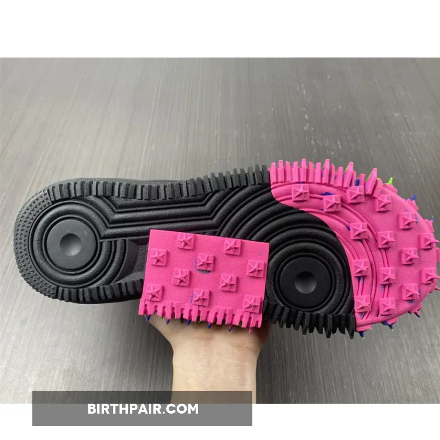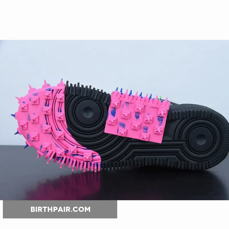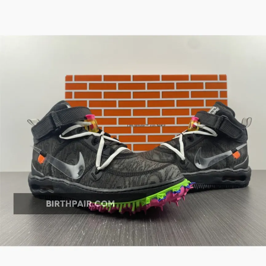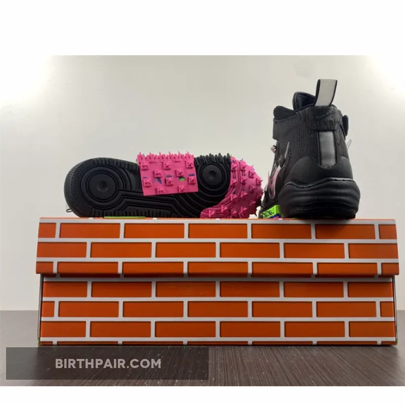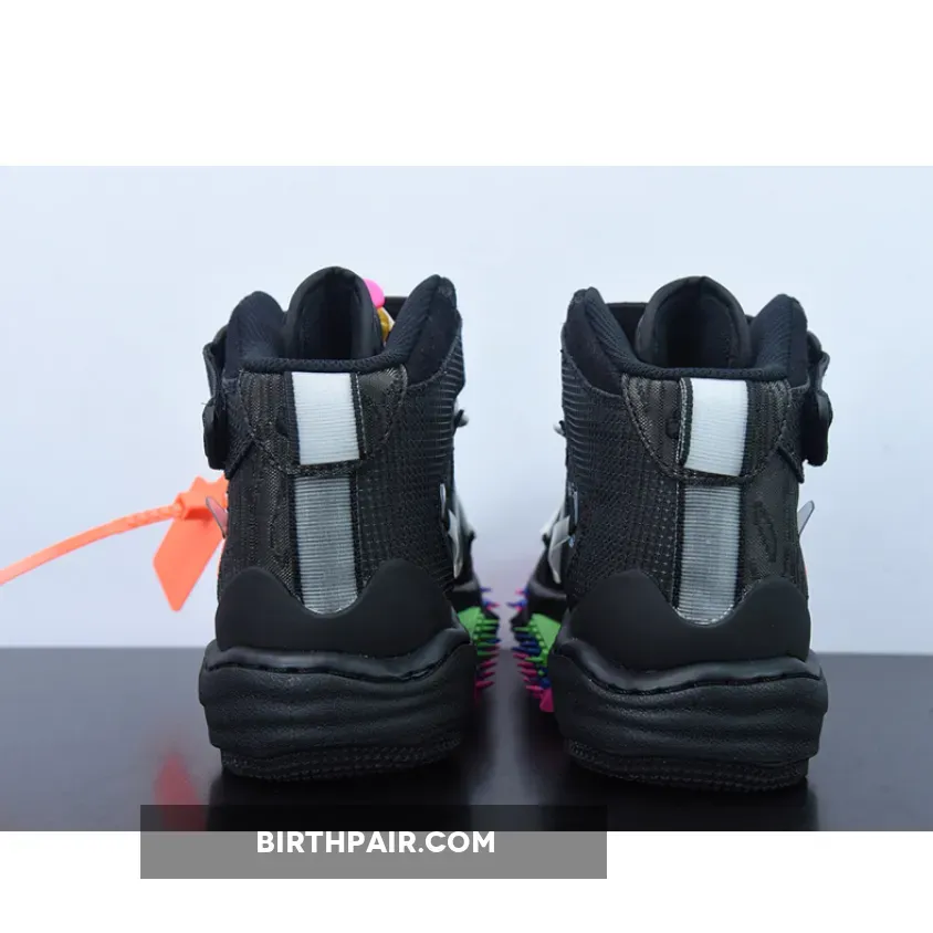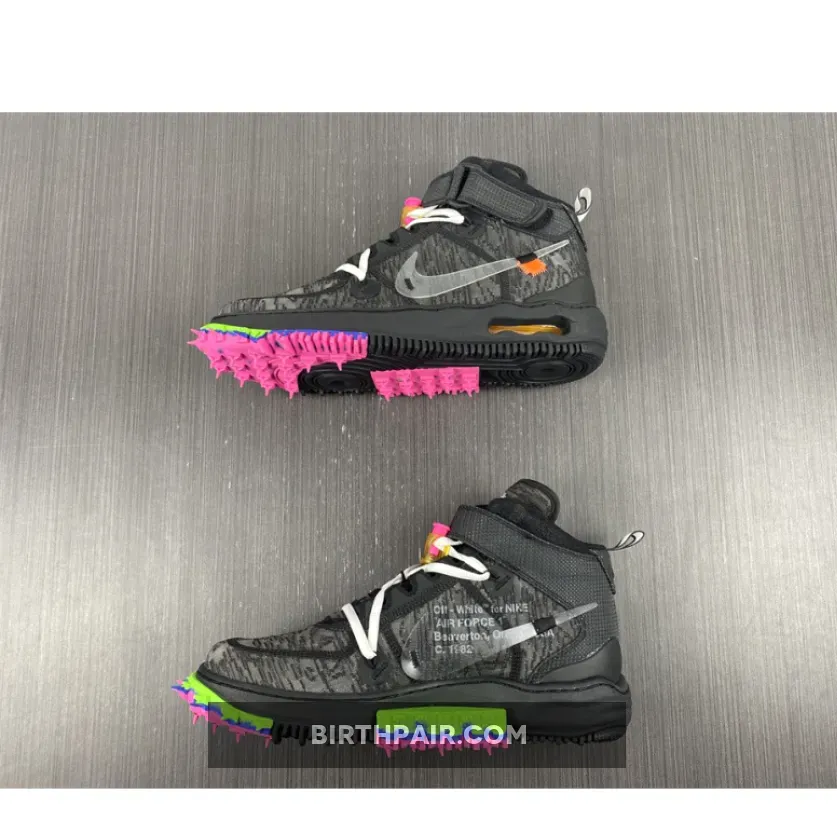 The Virgil Abloh-helmed Italian luxury fashion label, Off-White, and Nike Air Force 1 have a new iteration for their latest spiky collection, the Off-White x Air Force 1 Mid Black Pink. The semi-translucent upper features streaks of black knit details and reveals a white construction beneath. The black lockdown straps with a textured grid design wrap around the collar and are braced on the heel. The oversized profile Swooshes, accompanied by mismatched orange tabs, blend in with the upper with a completely transparent material. The signature Off-White Helvetica text in white is printed on the left medial side, underneath the Swoosh. The shoe also has a criss-crossed black and white lacing system punctuated by hot pink and translucent yellow lace toggles. A pure black midsole, housing Air units encased in bold orange, contrasts with the spiked tread in layers of royal blue, hot pink and vivid green, completing the outlandish look of the shoe.