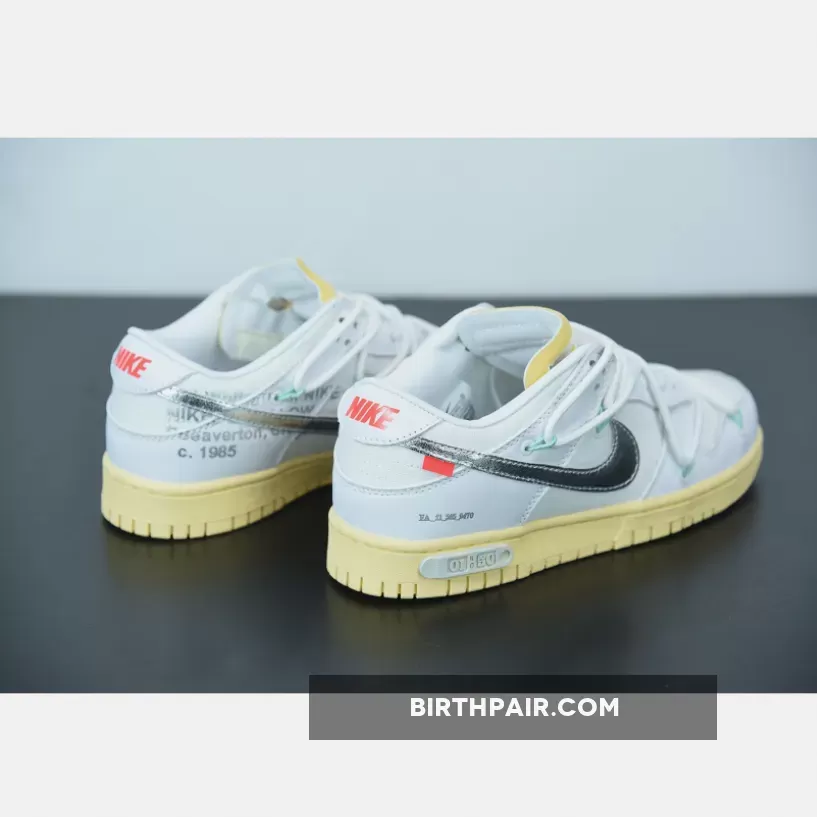 #50 interpolates familiar details and colors from Abloh’s past Nike collaborations with some fresh new details. It’s done up in black and equipped with a metallic silver Swoosh a la the Off-White™ x Nike Air Force 1 “MoMA” from 2018, while also adding the overlaid rope lacing system from past Off-White™ x Nike Dunk Low collaborations and cut-out oval detailing on the tongue that’s borrowed from the Off-White™ x Air Jordan 5.