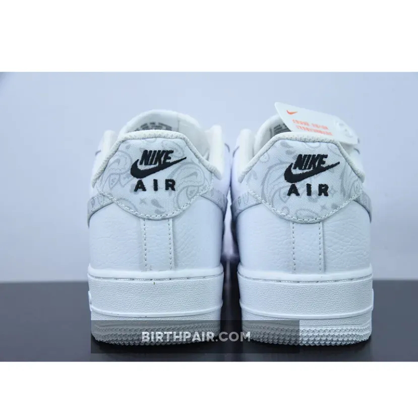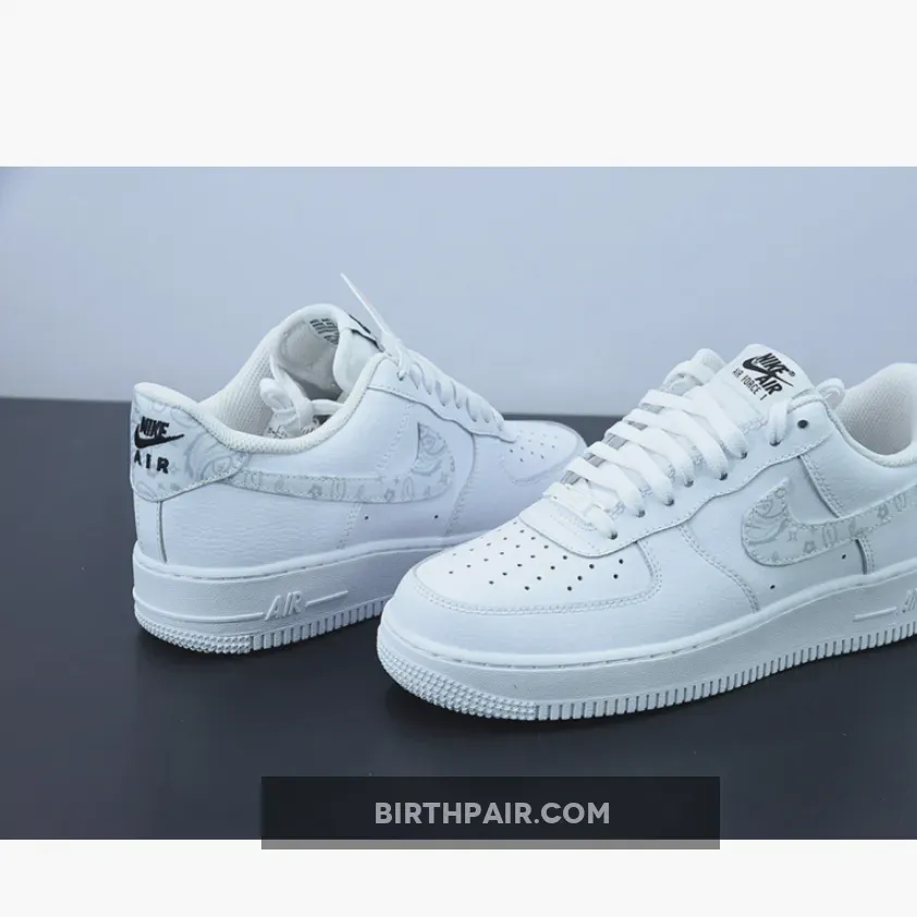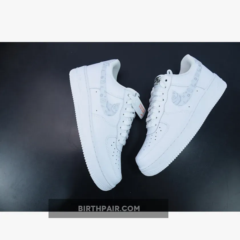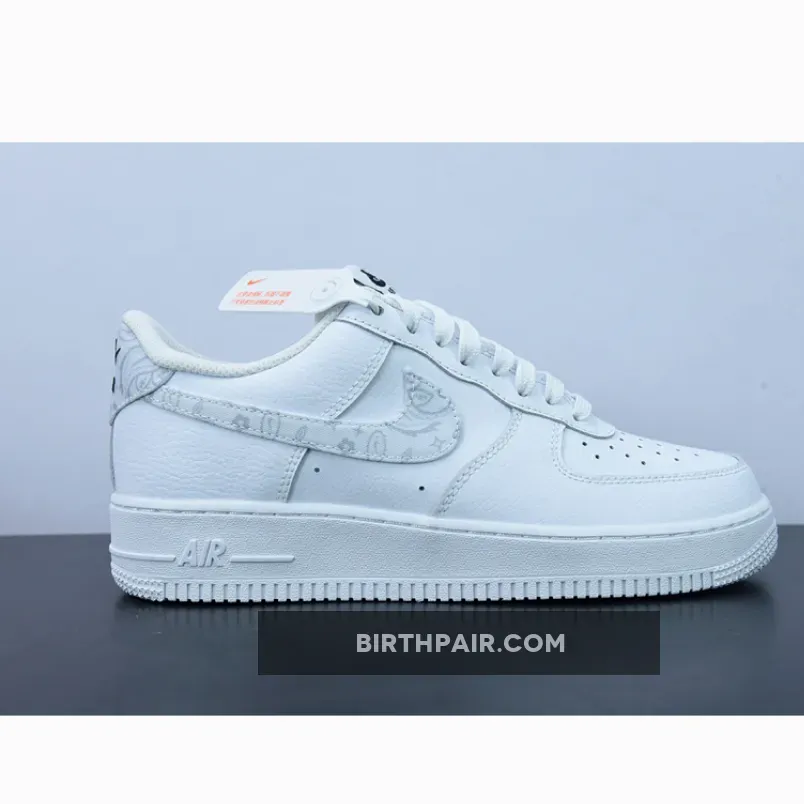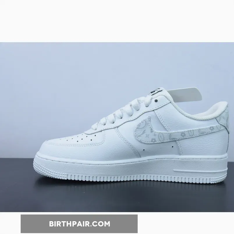 The Bruce Kilgore-designed Nike Air Force 1 has always been easy to dress up with its clean lines and its aerodynamic look. The silhouette’s newest variant looks like a stylish closet staple but with a touch of boho to add a little flair to your uniform. Meet the Nike Air Force 1 Low White Paisley.This AF1 Low starts out with a simple, tumbled white leather construction with nothing out of the ordinary except for the aforementioned bandana print in white and a very light grey on the signature profile Swooshes and the heel tab. If you zoom in on the paisley design of the shoe, you’ll notice that mini Swooshes have been worked into the design.