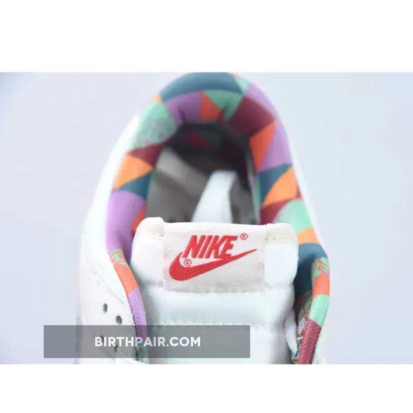 Nike’s Peter Moore-designed b-ball sneaker, the Dunk, has a fresh rendition with a boho aesthetic. Take a closer look at the Nike Dunk Low GS “Paisley Multi”.This smaller-sized, low-top Dunk, is crafted from full leather and showcases signature profile Swooshes with mismatched multi-coloured paisley prints on both the medial and lateral side walls. The base is classic white and complemented by off white overlays on the toe cap, mudguard, eye stay panel and foxing. with breathable perforations on the toe box. The sock liner also features a colourful graphic print that takes its cue from the Swooshes. Further accents include metallic silver heel tabs and vivid red tongue branding.