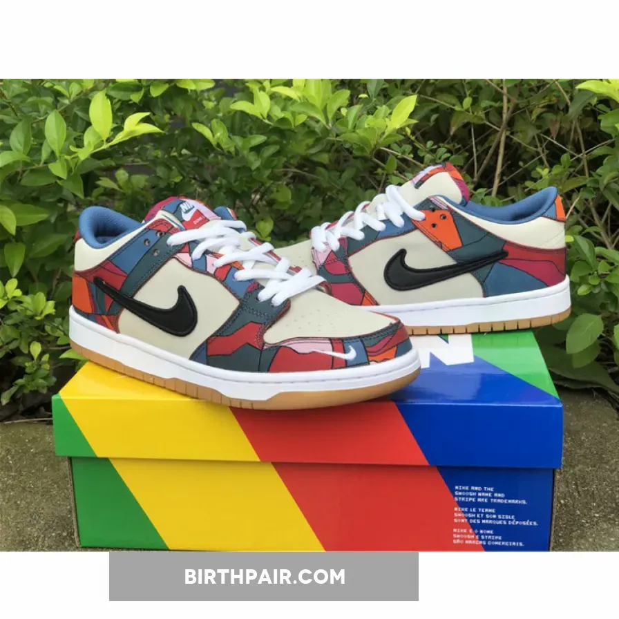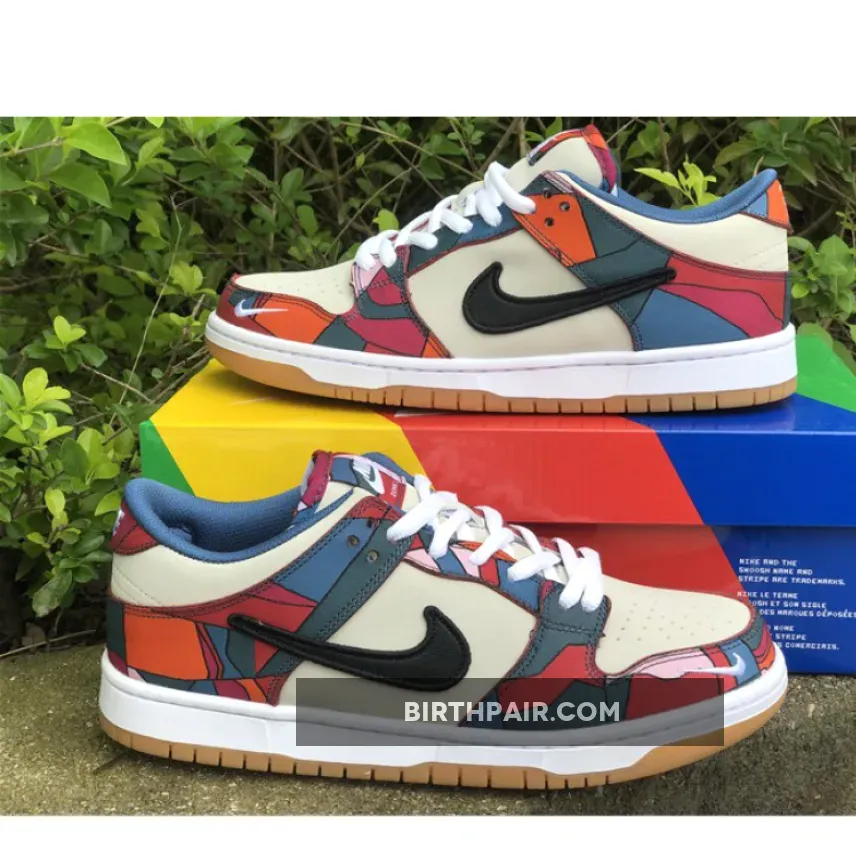 Dressed in a Fire Pink, Gym Red, Mocha, White, Royal Blue, and Black color scheme. Sample photos of Parra’s latest Nike SB Dunk Low have surfaced featuring a mismatched design in a mix of Dark Mocha suede with abstract patterns and White leather overlays.