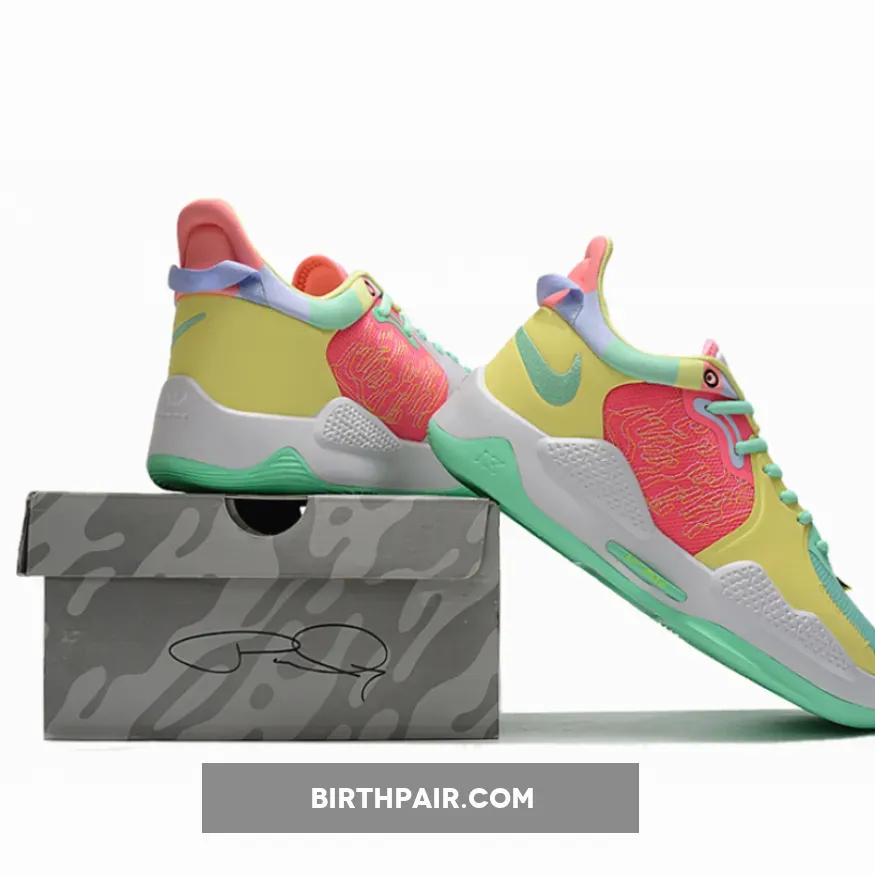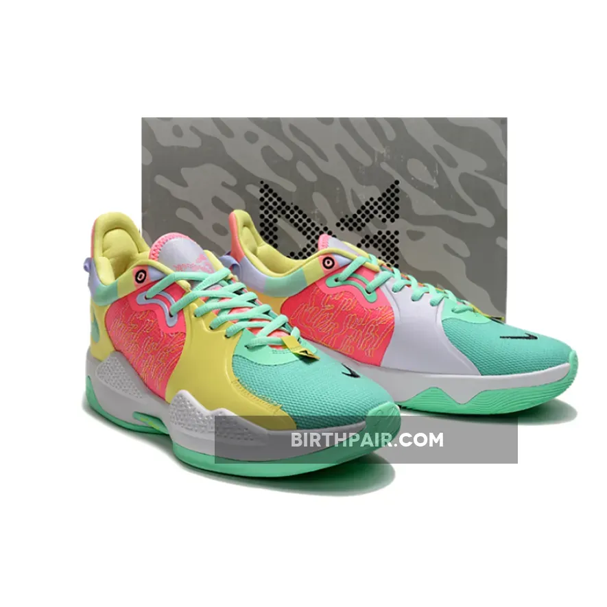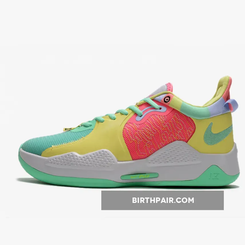 This Nike PG 5 comes dressed in a Green Glow, White, Sunset Pulse, and Black color combination. This pair pays tribute to Paul George’s daughters Olive and Natasha. The overall look reminds us of Spring and Easter.