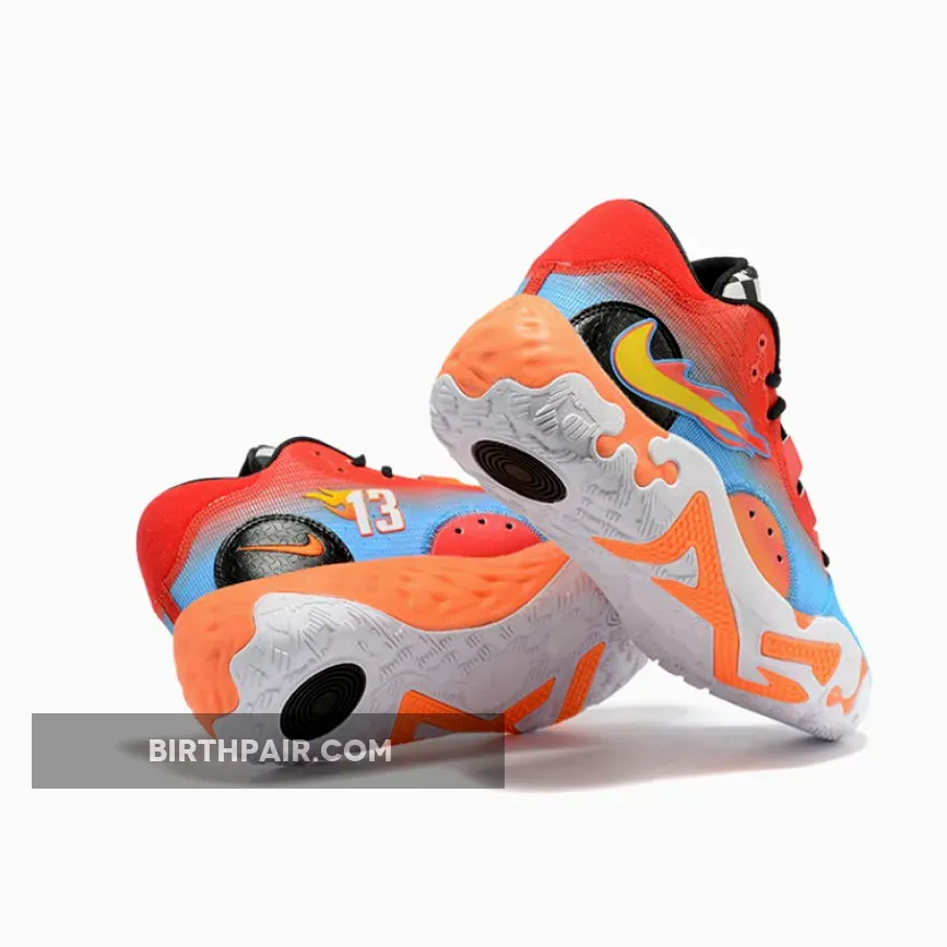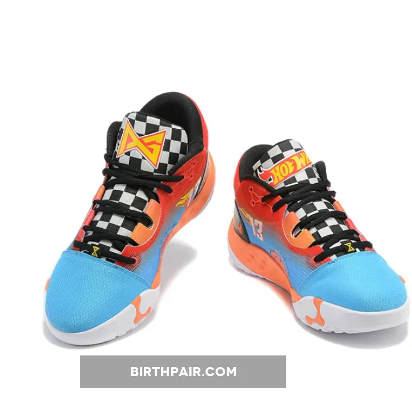 The nostalgic toy car brand has remixed his signature basketball model with a plethora of details. A majority of the synthetic upper has been formatted with a bold blue-to-red gradient effect, which likely reflects the Hot Wheels logo. Reversed Swooshes on the lateral panels and his number 13 on the medial side have been modified with fiery allure, and the entire throat has been covered in black and white checkerboard patterns to call out the final lap flag in a race. Tongues split their branding between the Clippers guard’s logo on the right shoe and the Hot Wheels insignia on the left. And to top everything off, the insoles have been styled with red flames and co-branded hits.