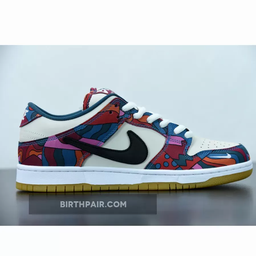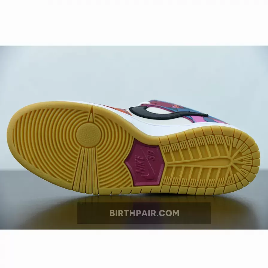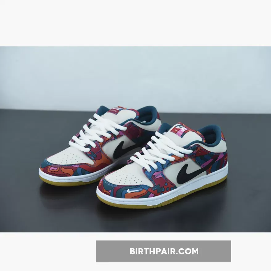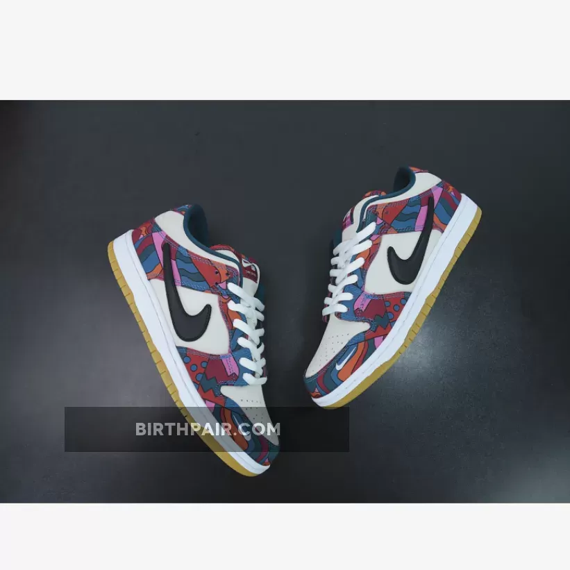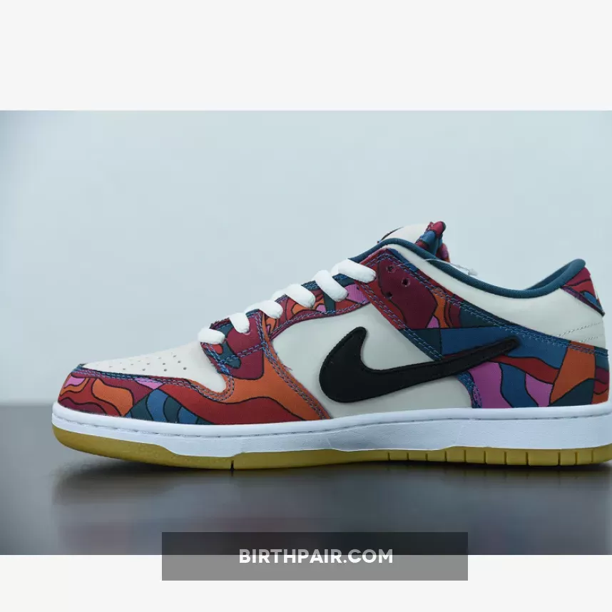 This Nike SB Dunk Low features a Fire Pink, Gym Red, Mocha, White, Royal Blue, and Black color combination. The images used are a sample that shows that the pair comes in a mismatched theme while utilizing Dark Mocha suede along with abstract patterns. Next, we have White leather on the overlays, Blue on the liner, with speckled detailing on the laces. Lastly, a White midsole and rubber outsole finishes the look.