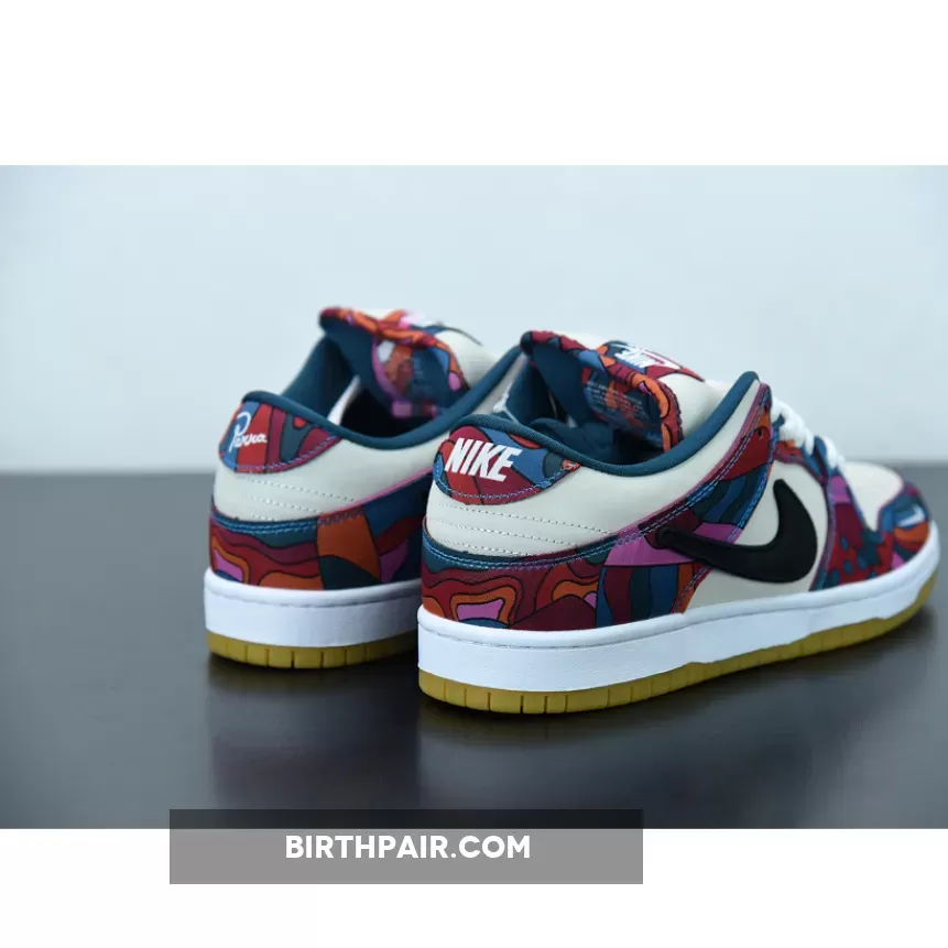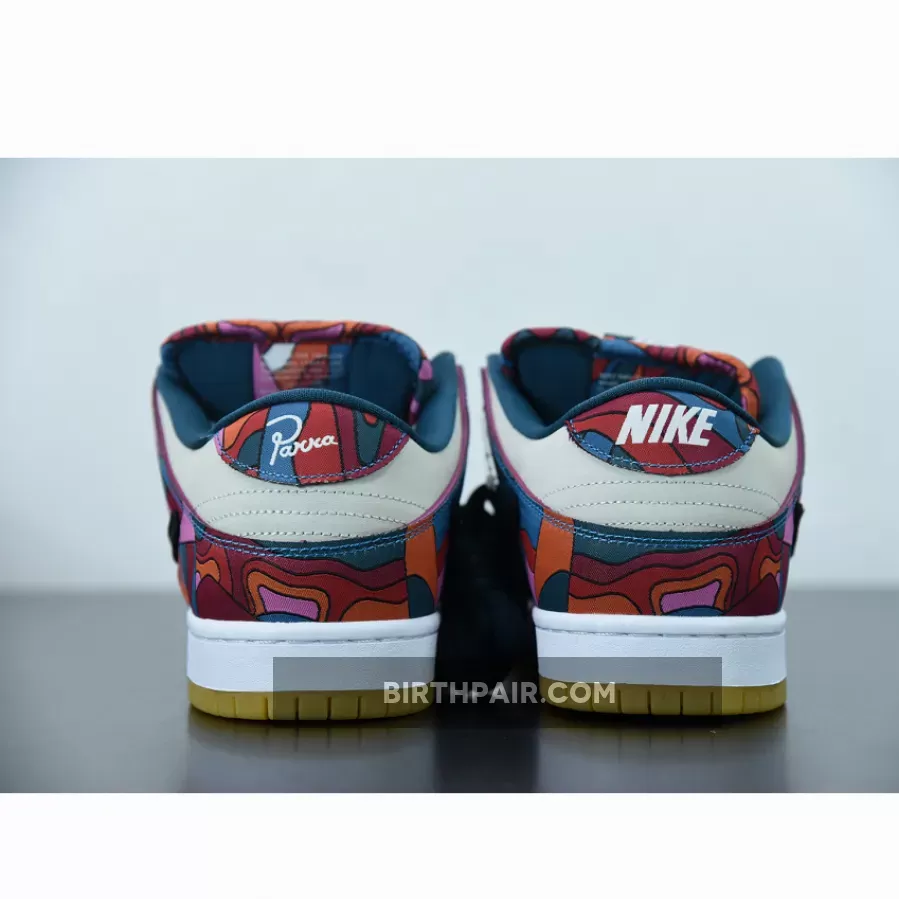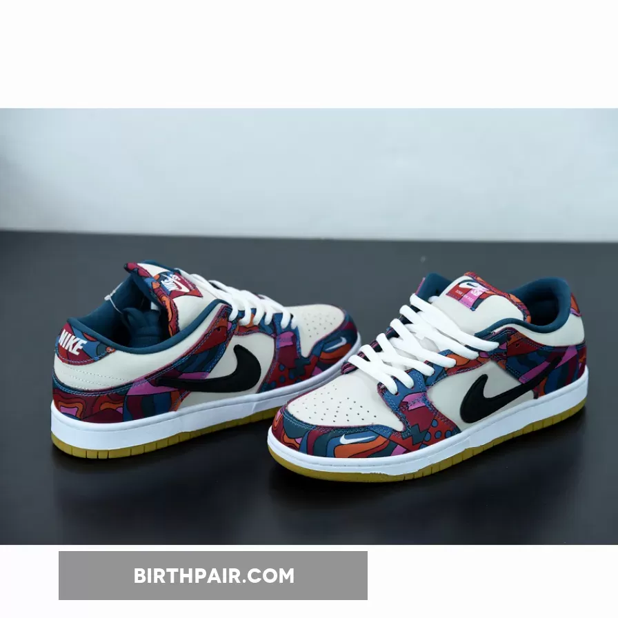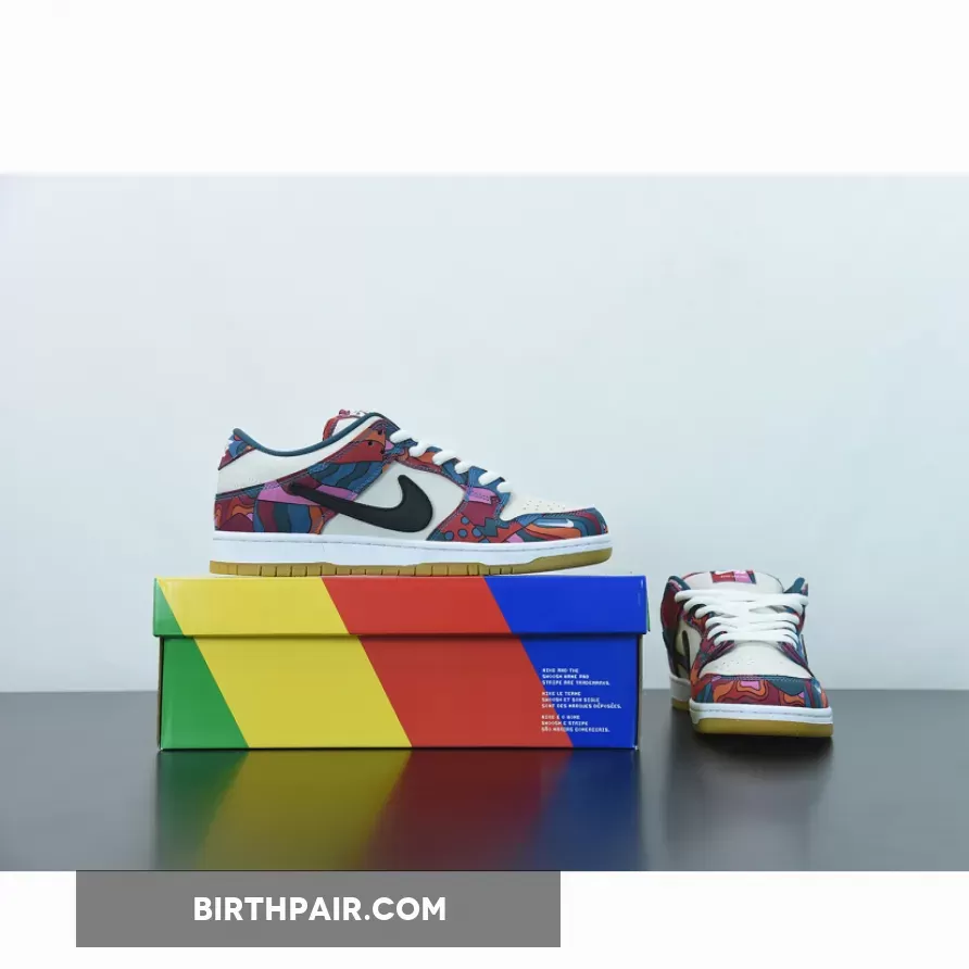 This Nike SB Dunk Low features a Fire Pink, Gym Red, Mocha, White, Royal Blue, and Black color combination. The images used are a sample that shows that the pair comes in a mismatched theme while utilizing Dark Mocha suede along with abstract patterns. Next, we have White leather on the overlays, Blue on the liner, with speckled detailing on the laces. Lastly, a White midsole and rubber outsole finishes the look.