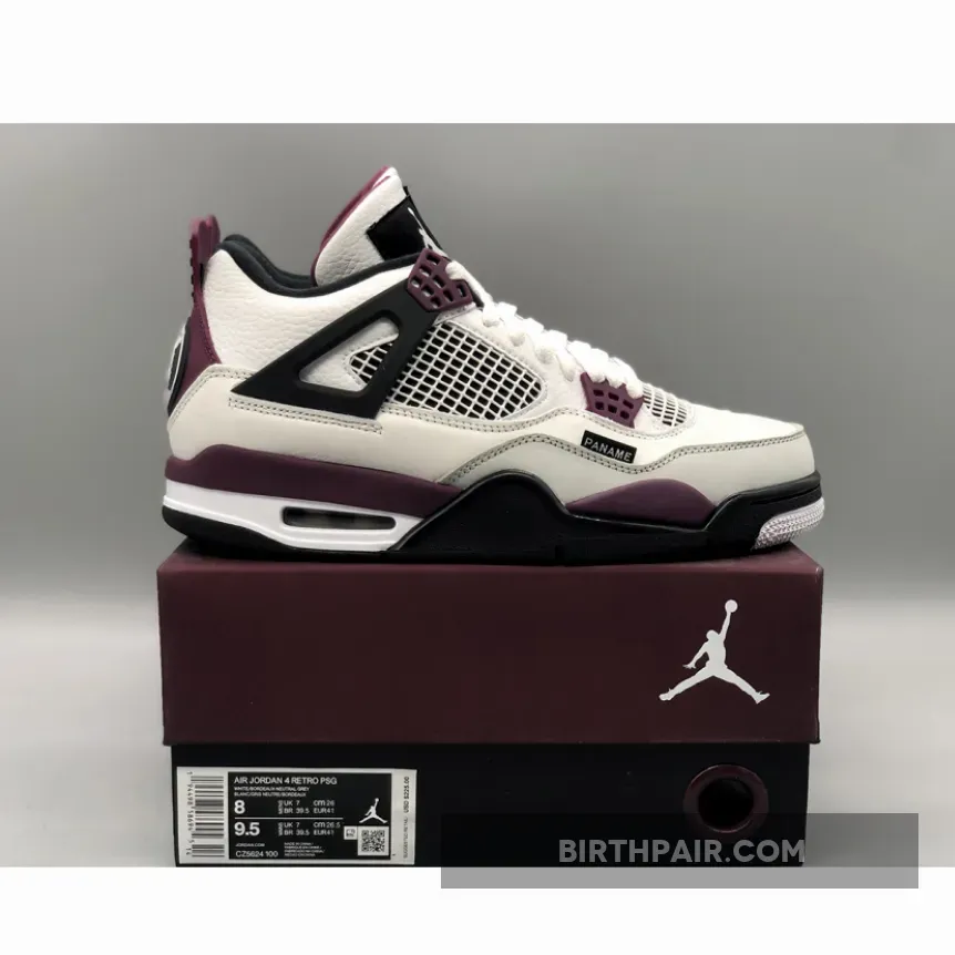 “I’m thoroughly impressed with my Air Jordan 4 Retro ‘PSG’ purchase! ? The white leather is smooth and premium, while the subtle grey accents add a touch of sophistication. The Bordeaux highlights pop nicely against the crisp white background ?. Overall, an excellent product that met my high expectations ?.”