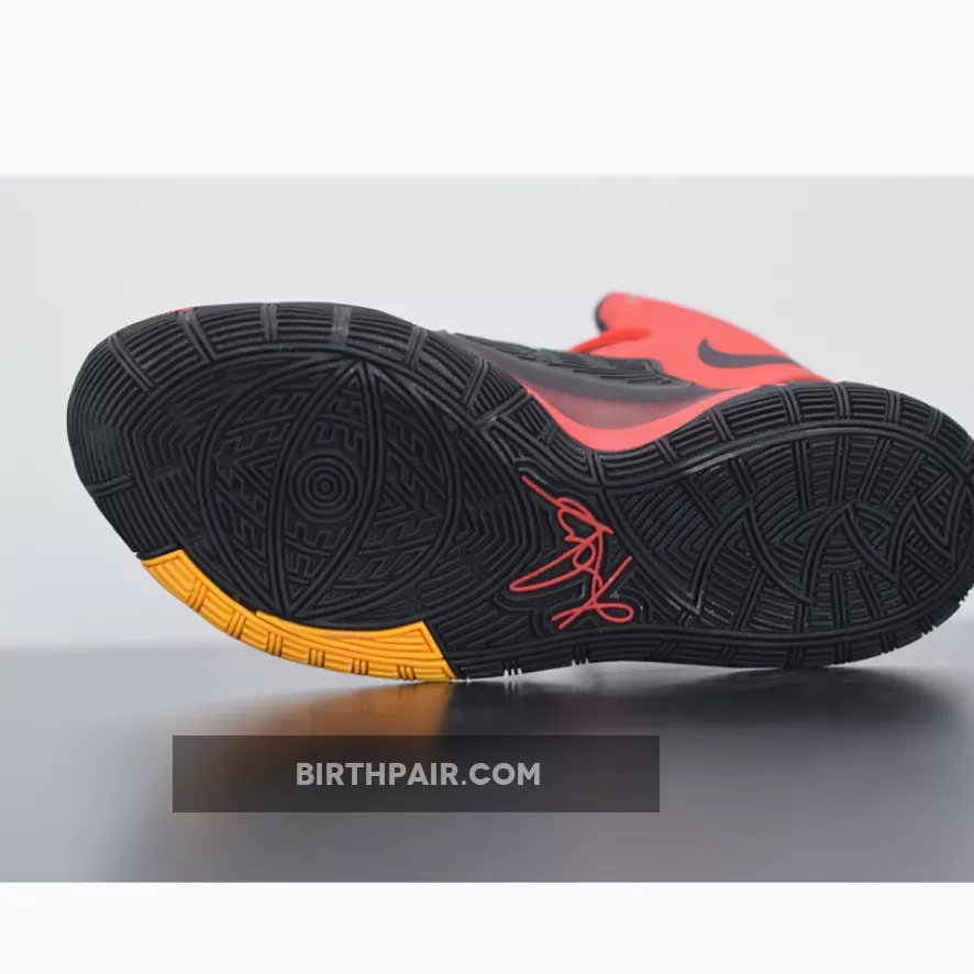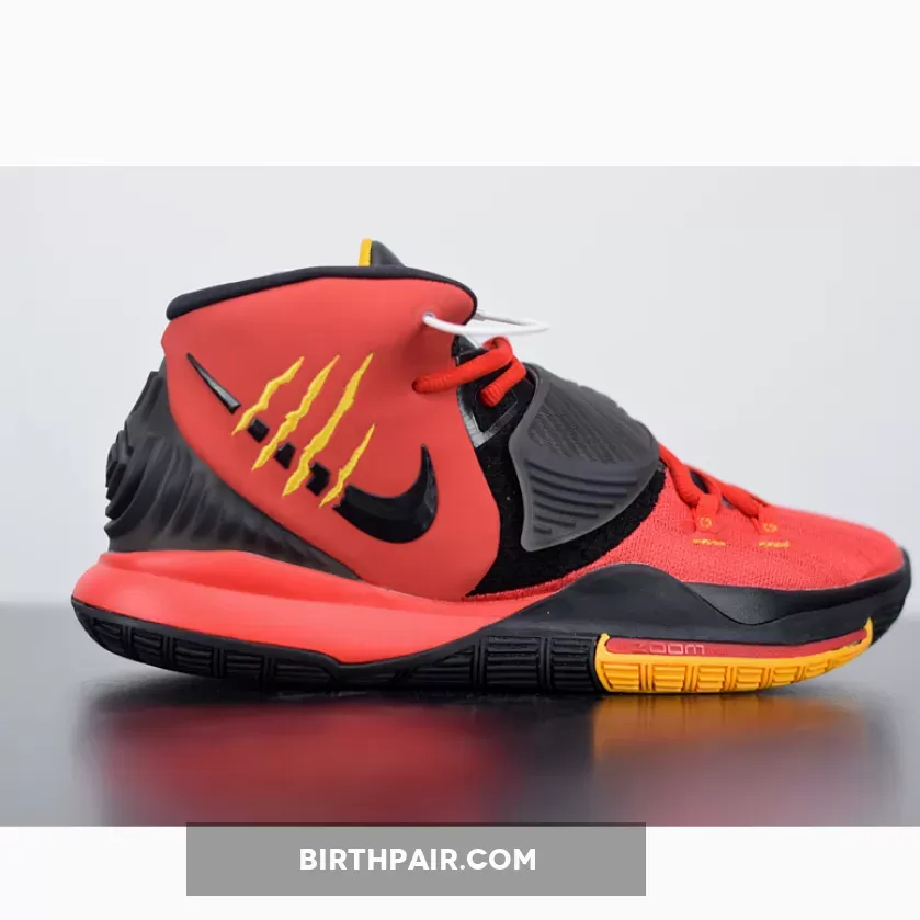The Kyrie 6 follows its predecessor with an all-red upper with black and gold accents, including the signature scratch marks. The shoe also combines both Kobe’s and Kyrie’s signature logos on the tongue for a touching detail.