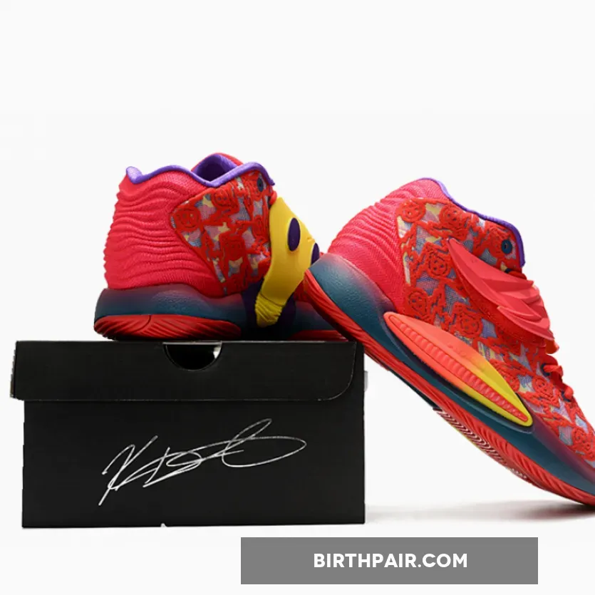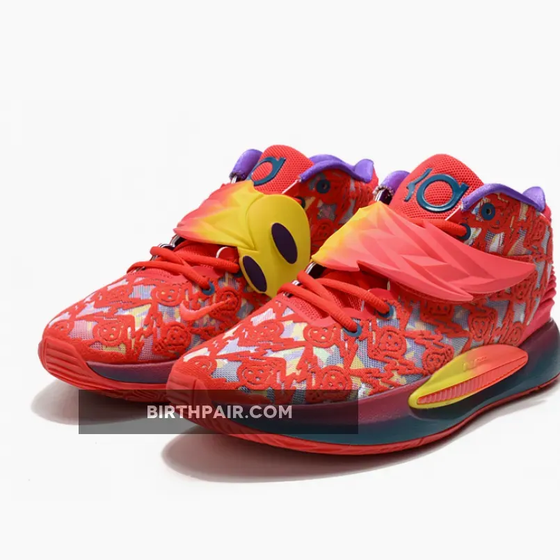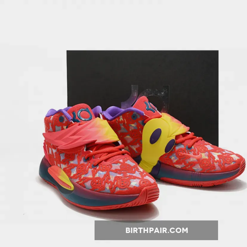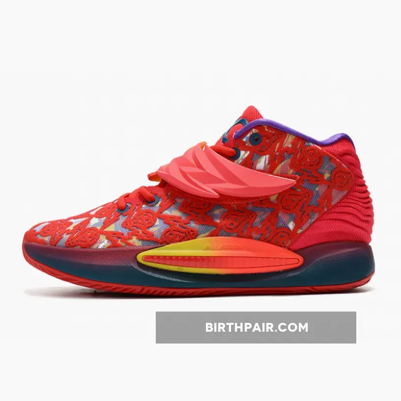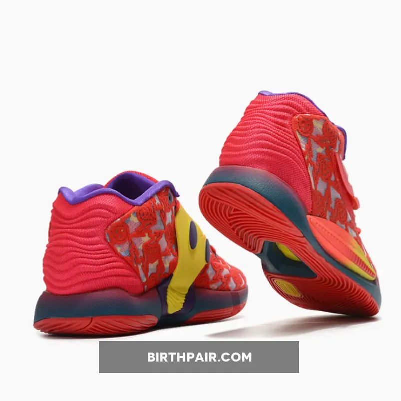 The Ron English x Nike KD 14 Red/Blue-Yellow offers a striking design with eye-catching graphics, vibrant colors, and meticulous attention to detail. The combination of custom molded mid-foot straps and gradient midsole elevate the overall aesthetics, making this sneaker a visually captivating statement piece.