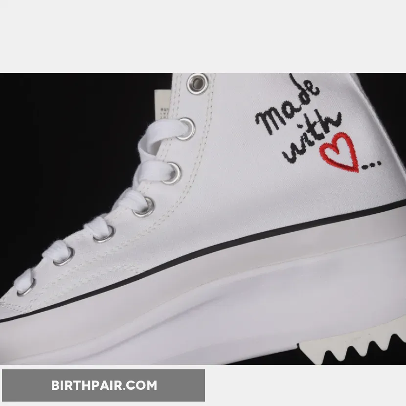 “The Converse women’s Run Star Hike High ‘Made With Love’ delivers a handwritten message on the sneaker’s pristine white canvas upper. Both sides panels are marked with embroidered text that lets the wearer know the kicks are made with love, expressed via an embroidered heart in Bright Poppy.”
