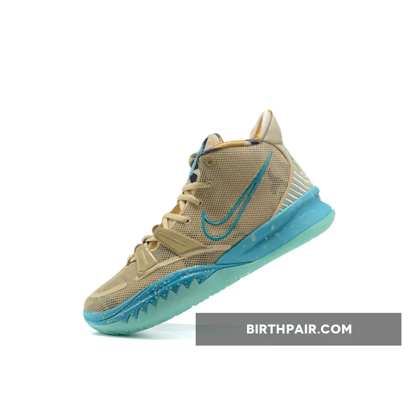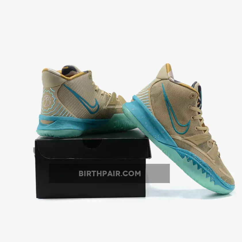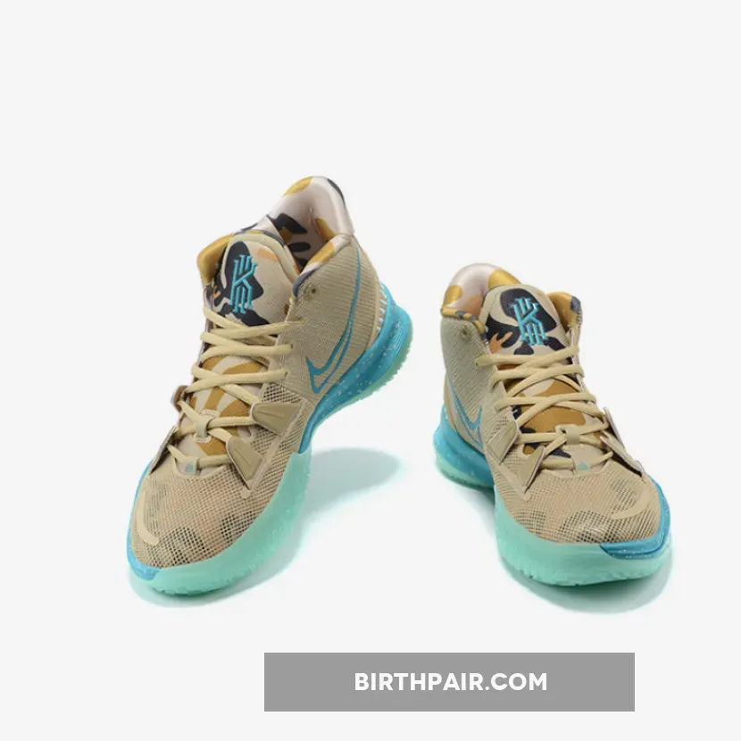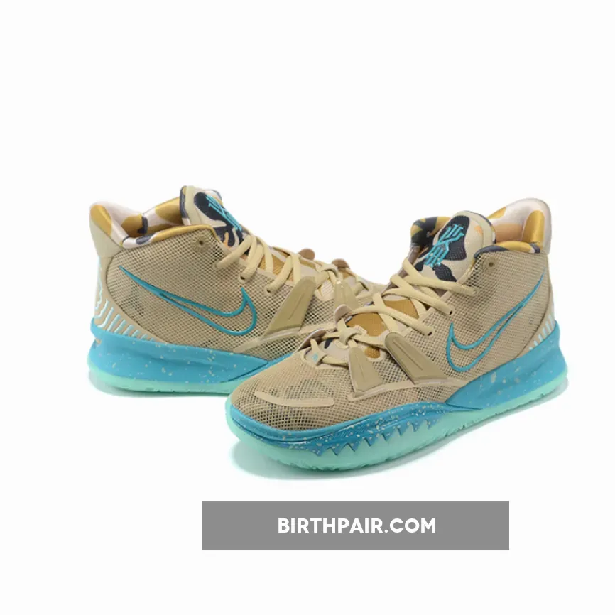 This offering of the Nike Kyrie 7 features a Tan-colored base highlighted with Aquamarine contrasting accents throughout including its speckled midsole and translucent outsole. Camouflage print appears on the tongues and lining while having embroidered heels to complete the design.