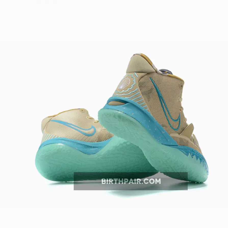The overall look and feel of this Nike Kyrie 7 are reminiscent of beaches. Featuring Tan across the upper that possibly could represent sand white Aquamarine details appear throughout for the ocean. Next, the pair features speckled detailing on the midsole and a translucent outsole. Following, camouflage print covers the tongue and liner while a beachball and seashell are embroidered on the heel to finish the look.