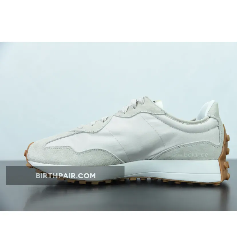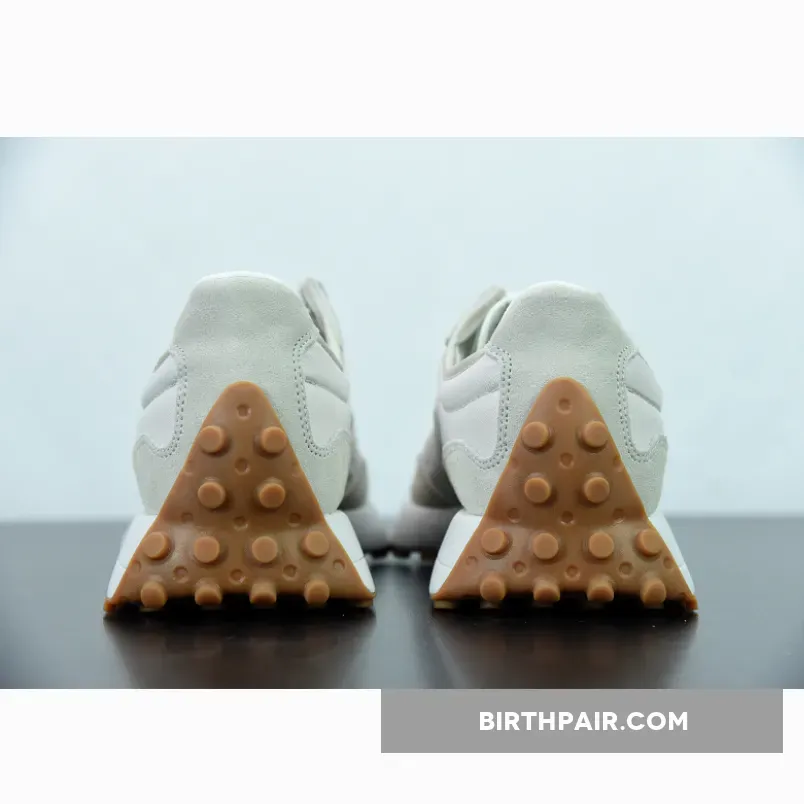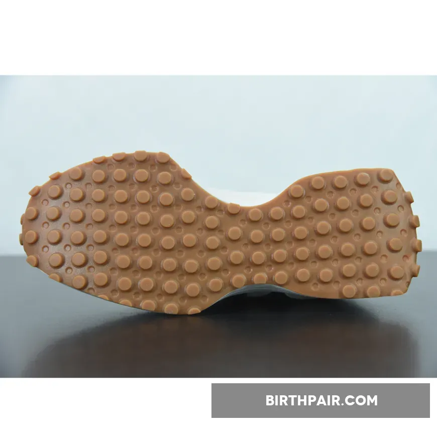 . The nylon base of the upper is in a creamy light mocha that matches the pigskin suede on the toe cap, mud guard, heel counter and eye stay. The only thing that interrupts this monochromatic palette is the striking forest green of the outsized lateral “N” logo and the branding on the tongue tab. This is not the case on the medial side which is totally monochromatic. Use our New Balance 327 size guide to know they fit.