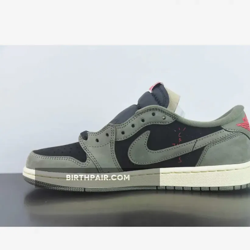 Anticipations surround the Jordan 1 Low “Black Olive,” crafted by Travis Scott, with expectations of incorporating distinctive elements. The shoe boasts a mix of leather and nubuck, mesh tongues, and inner lining. Notable details include the iconic backward Swoosh on the side, Cactus Jack tongue branding, and the rapper’s face logos from Houston on the heels. The design is capped off with an aged midsole for a vintage vibe.