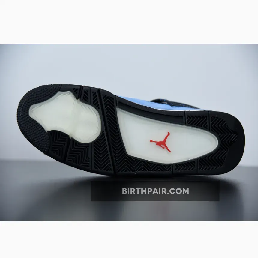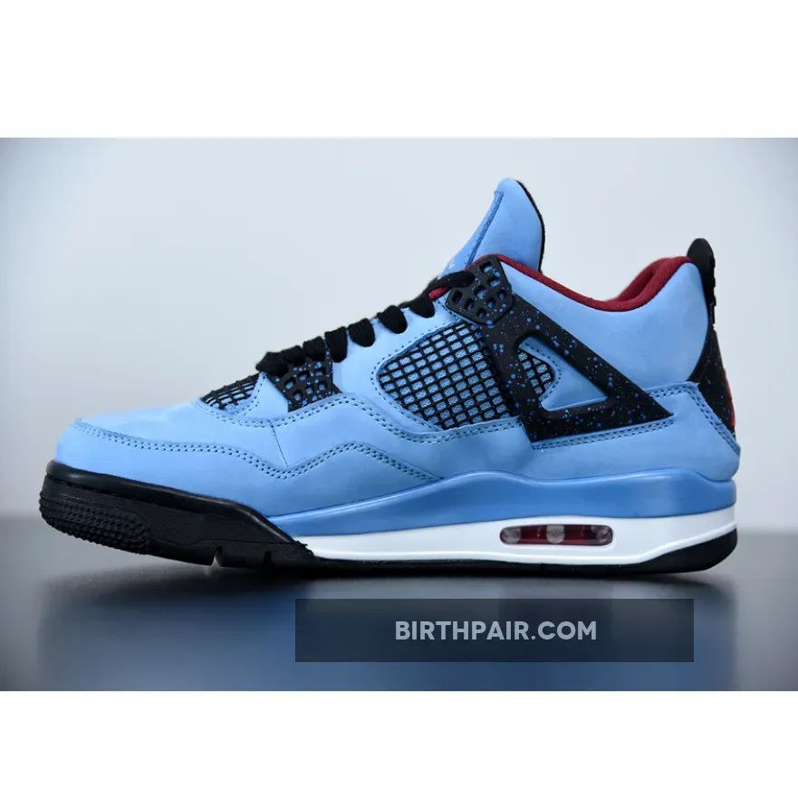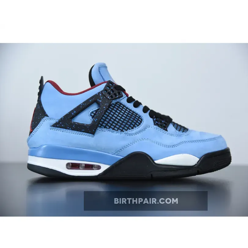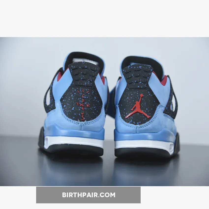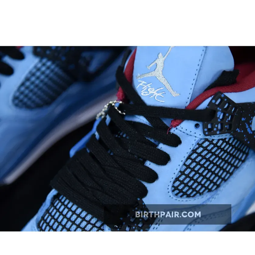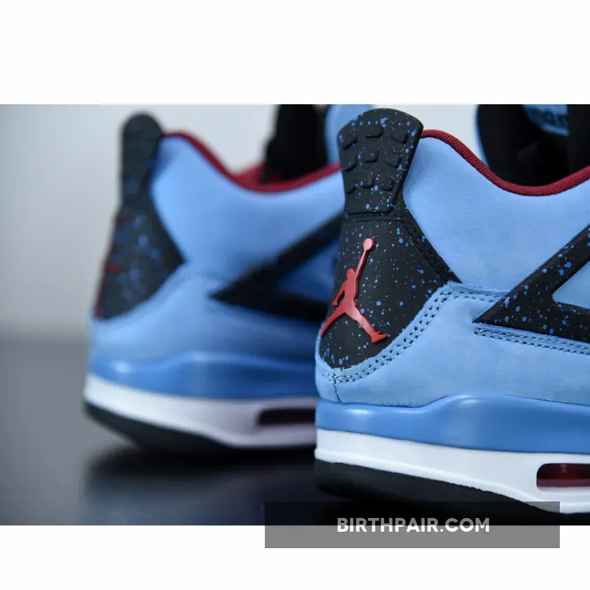 Music artist Travis Scott hails from Houston, where the Oilers used to take the field in red, white and blue uniforms. The Travis Scott x Air Jordan 4 Retro ‘Cactus Jack’ colorway pays tribute to the city’s bygone football team with a Durabuck leather upper dressed in University Blue and a Varsity Red insole. The black lace cage and a heel panel feature a light blue speckle pattern. Cactus Jack branding appears on the left heel in Varsity Red, with a matching Jumpman logo on the right.