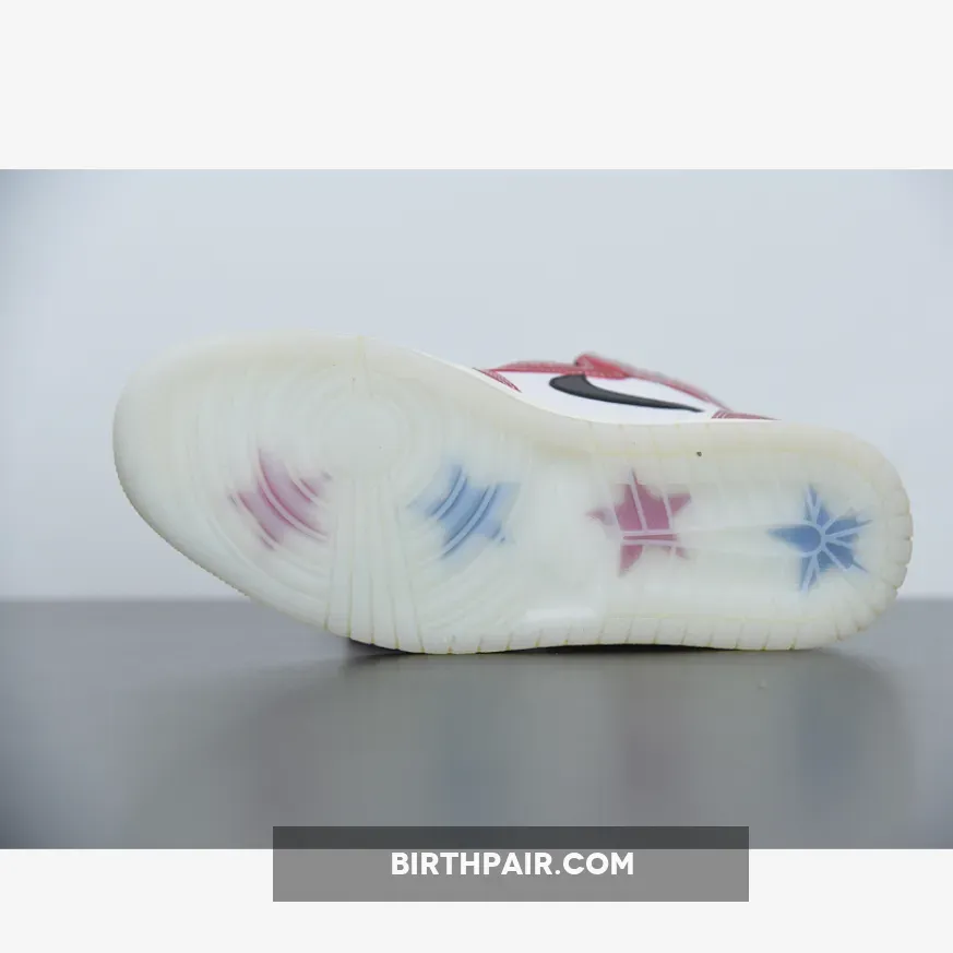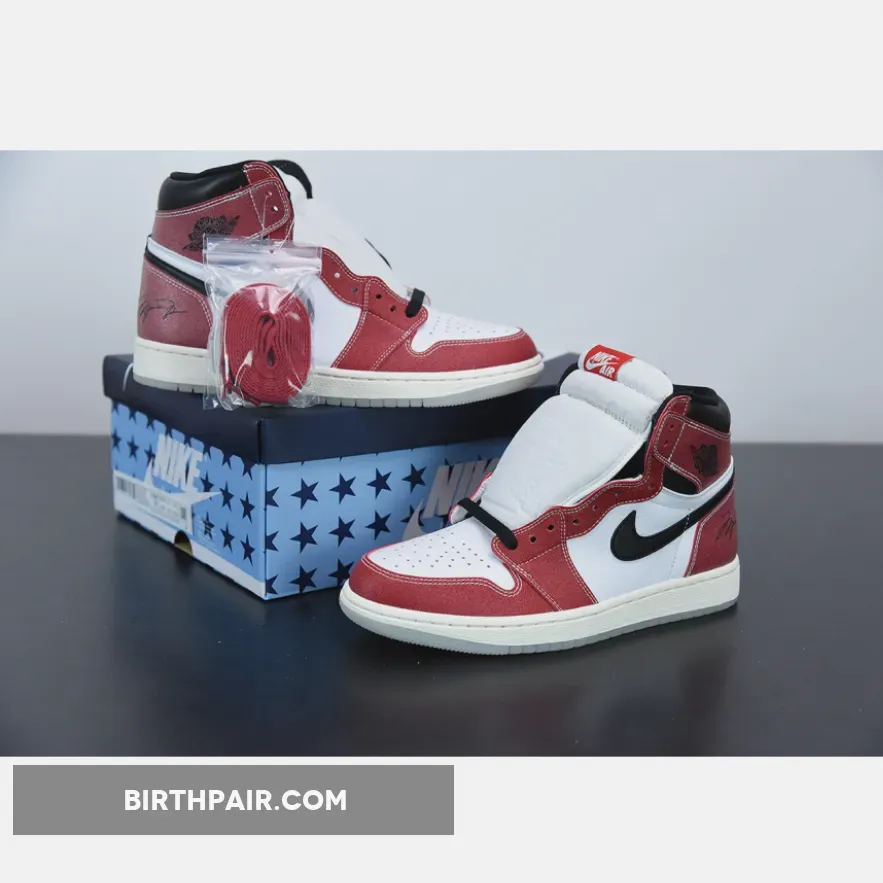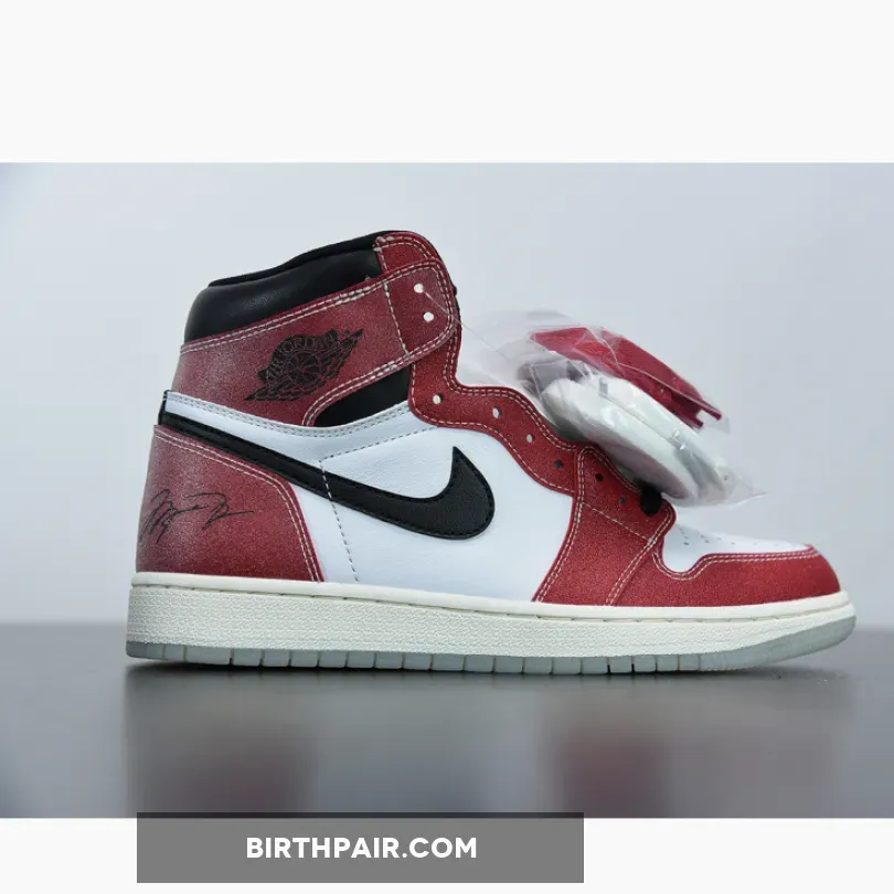 The Air Jordan 1 Retro High OG Trophy Room is a luxurious take on the classic Chicago colorway. The white leather base with glittery red overlays and black Swoosh is a stunning combination. The translucent outsole with blue and red stars adds a touch of intrigue. Overall, a sleek and elegant sneaker perfect for any collector.