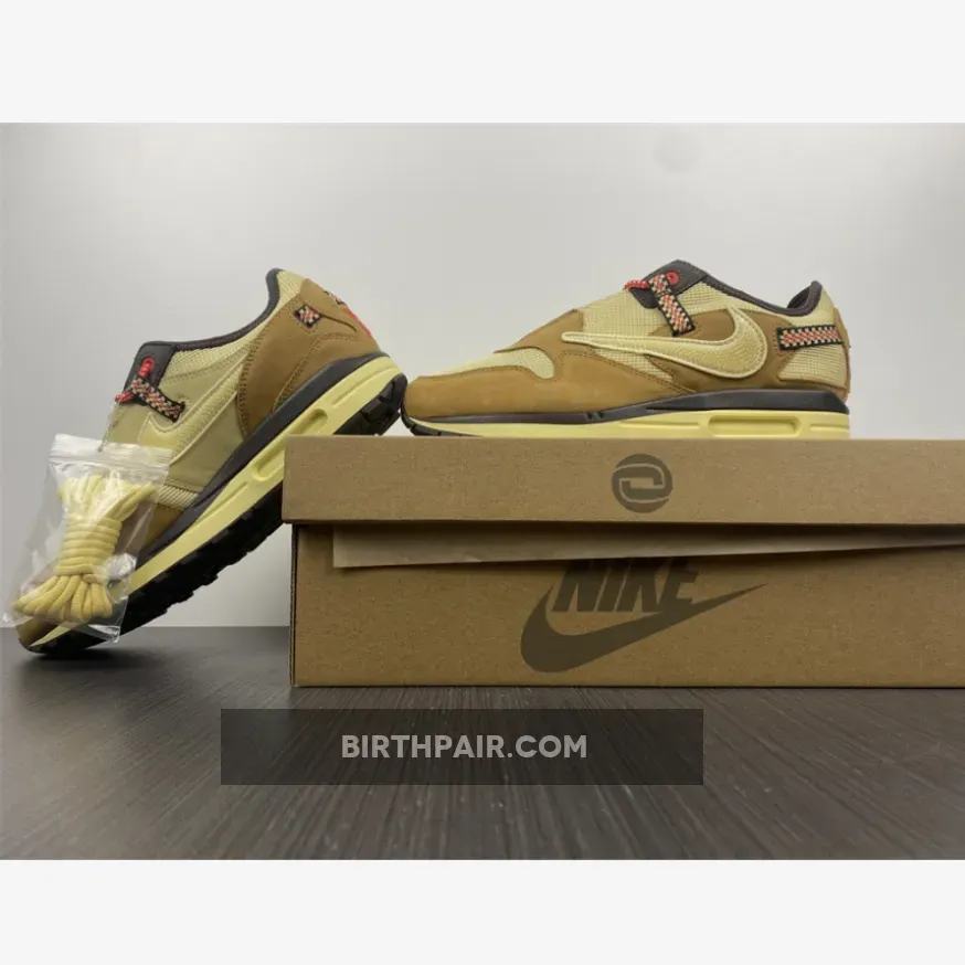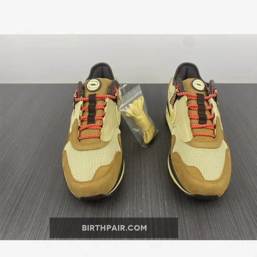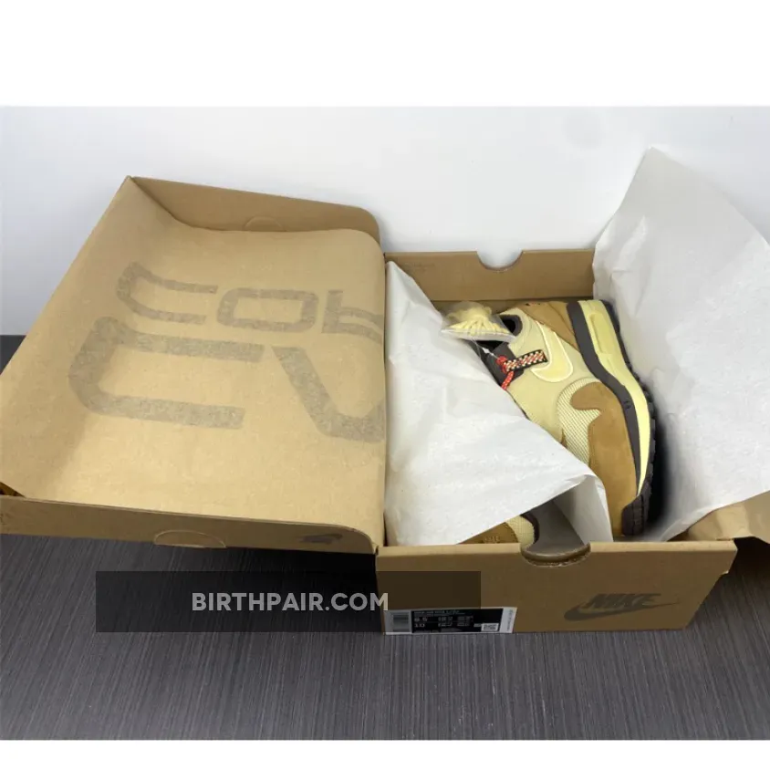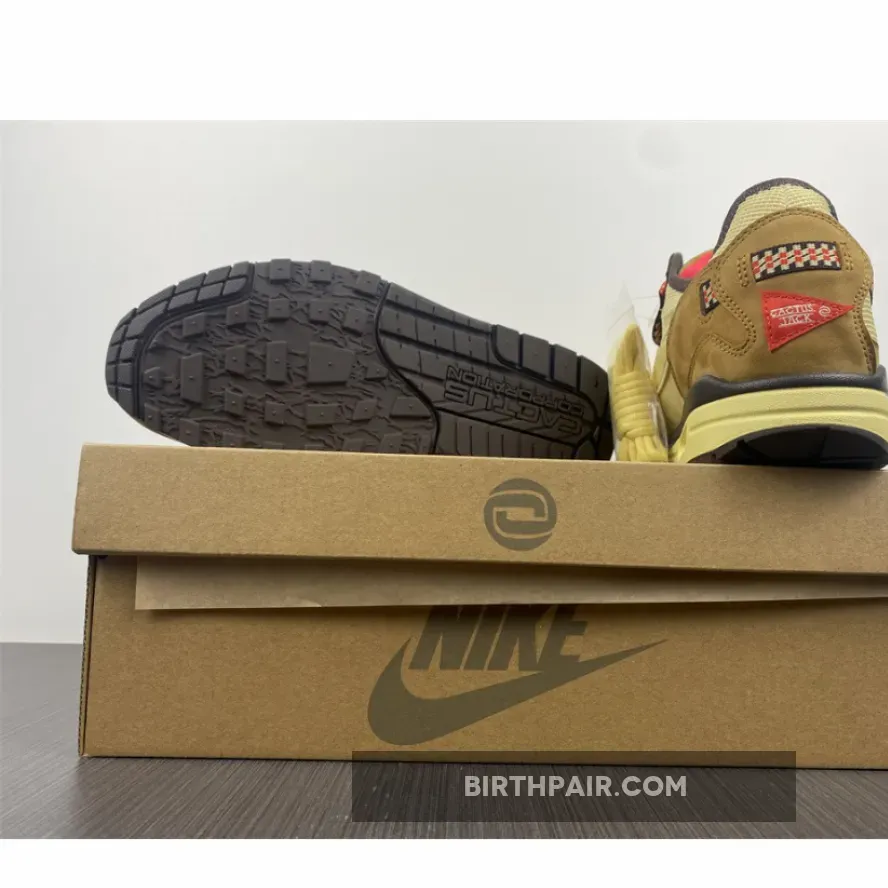 The “Wheat” iteration dons a “Saturn Gold/Tea Tree Mist/Tent” color theme overall, with the mesh base accompanied by leather overlays on the upper. Elsewhere, the reverse Swoosh is placed on the laterals, while “Cactus Jack” logos are spotted on the tongue and heels. The kicks are complete with trail-inspired details and tonal midsoles, which are contrasted with rubber outsoles.