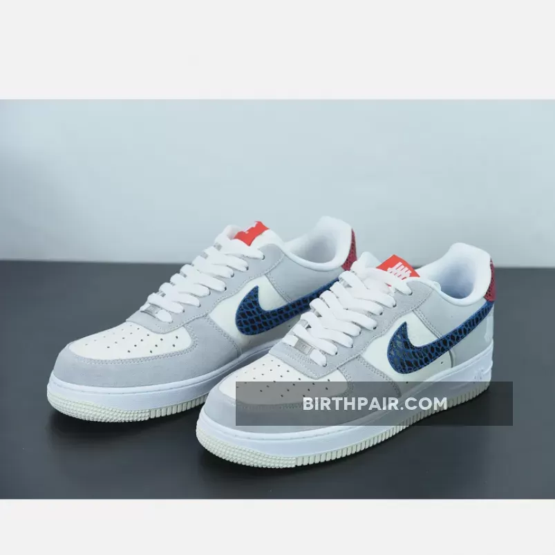 5 materials, 5 strikes, the offering is a vivid arrangement of texture and color. The Swoosh as well as the heel tab don snakeskin throughout, the scales colored in a bright blue and deep red, respectively. Elsewhere, suede overlays opt for a grey finish, while the underlying leathers dress up in a subtle off-white shade. Underfoot, white midsoles are paired with yellowed treads, while bright orange pops along the tongue label and the co-branded insole.