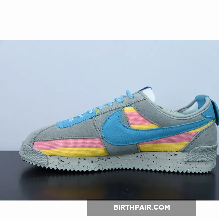 Cult clothing brand, Union LA, is collaborating with Nike to introduce a funky new collection. Check out the Union LA x Nike Cortez Grey Yellow. This running shoe is both bold and fun, showing off bright colours and experimenting with different materials. The upper begins with a canvas base with a woven finish, featuring vibrant yellow and pink stripes. Soft suede overlays in light grey wrap around the shoe. Bright blue suede profile Swooshes grace the mid-panel, matching part of the eyestay panel, the laces and the co-branded tongue label. Pops of yellow stand out on the leather lace tag and the “UN/LA” label hanging below the laces.