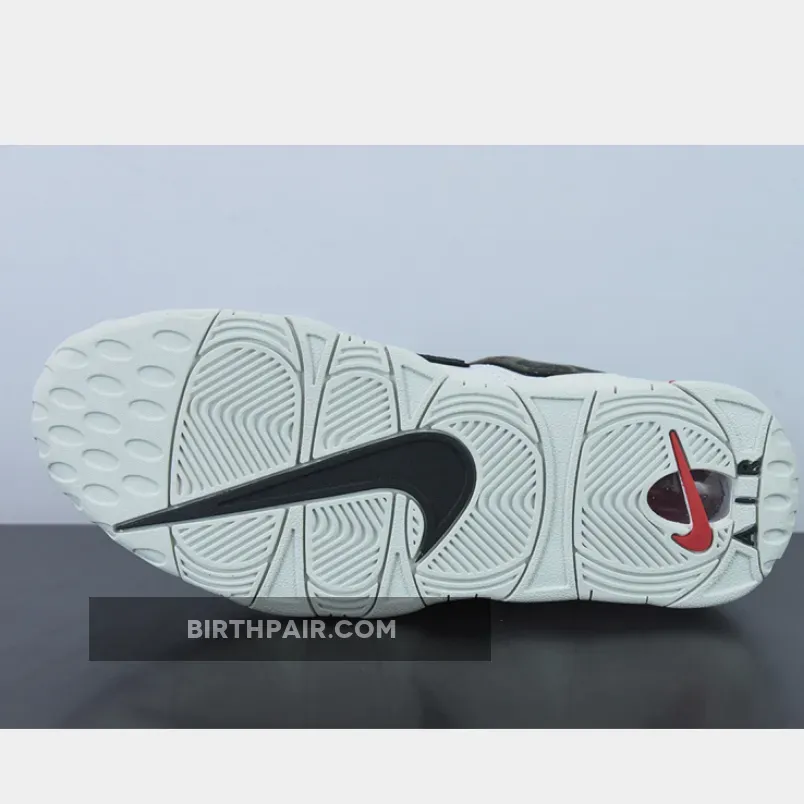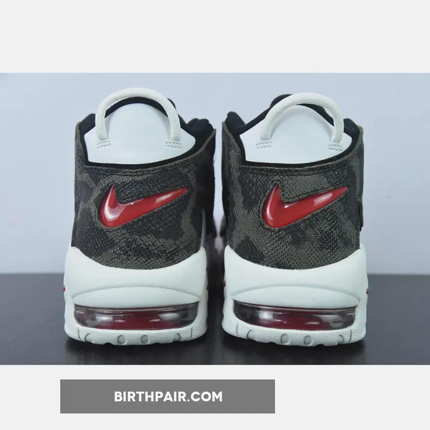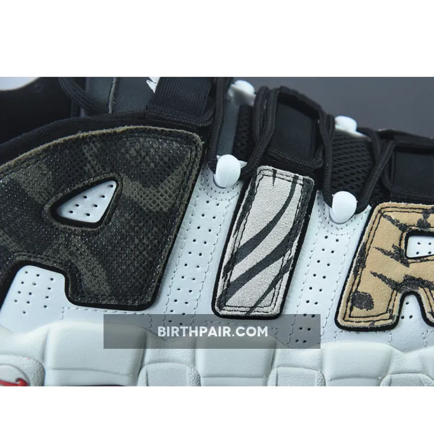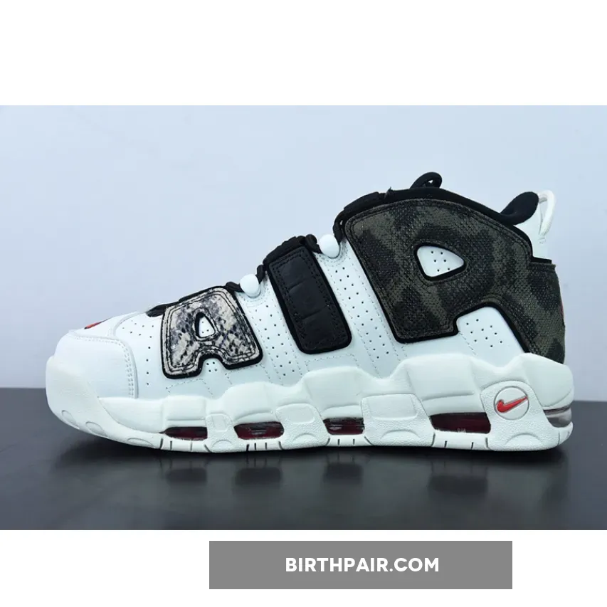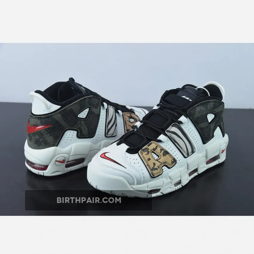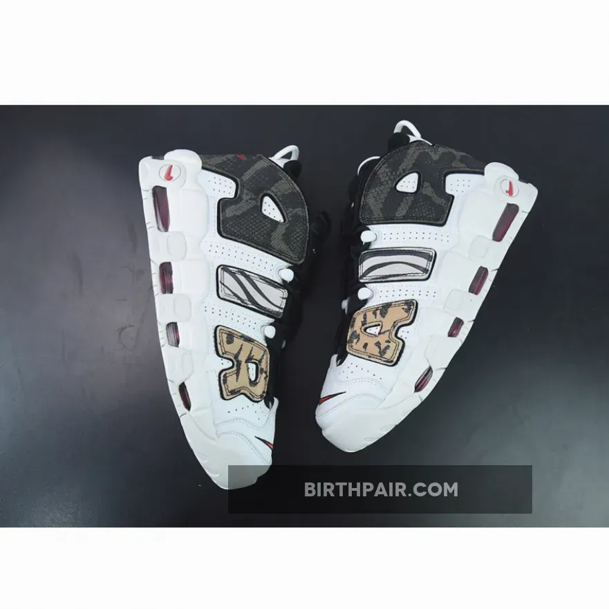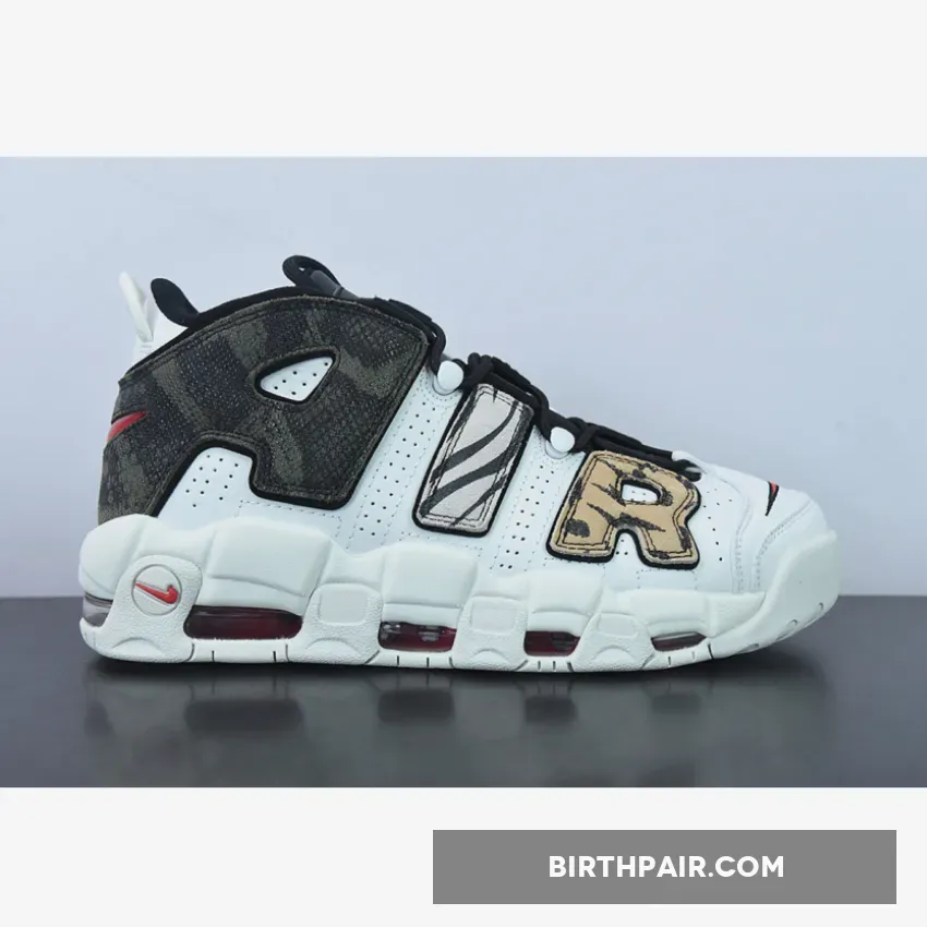 This offering of the Nike Air More Uptempo features a Sail leather base with Black tongues, lining, and matching laces. Highlighting the shoe are different animal prints used on the oversized “AIR” branding. Other details includes slash marks on the tongues, Red contrasting accents atop a Sail rubber sole.