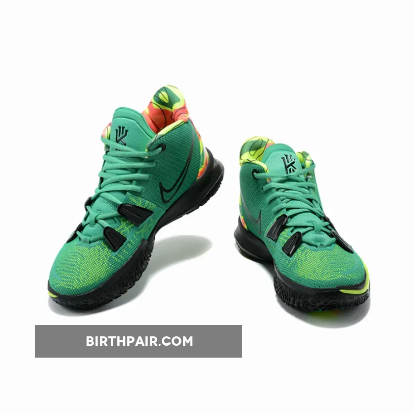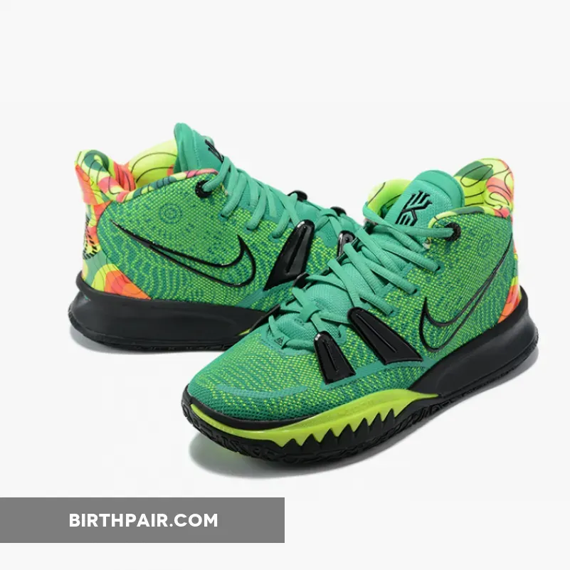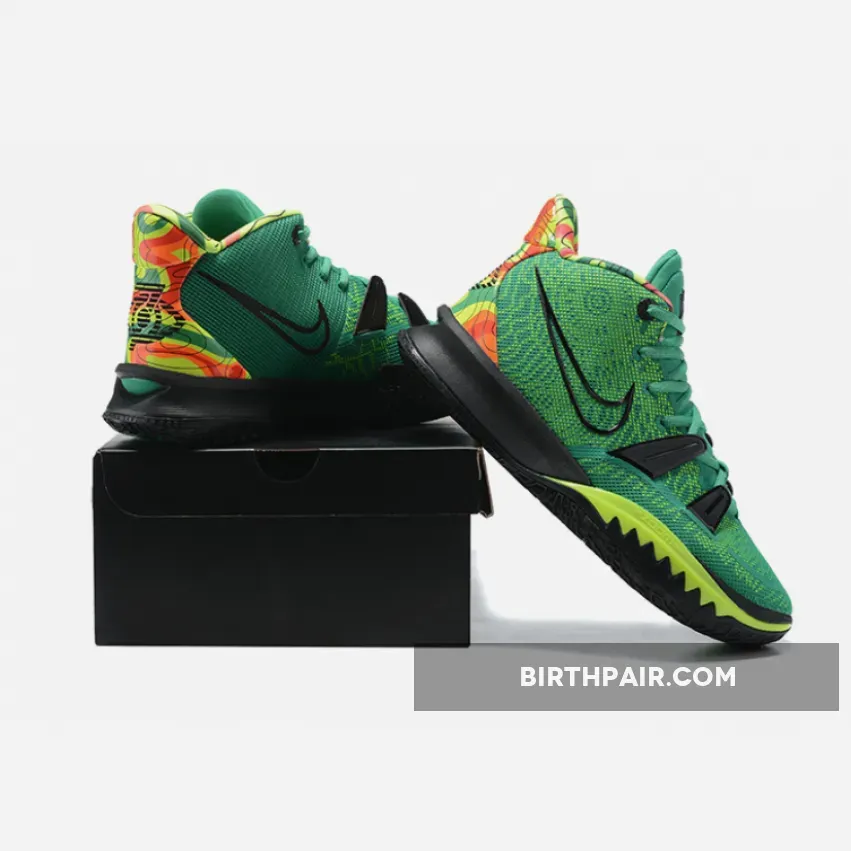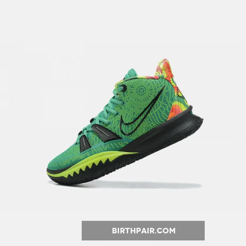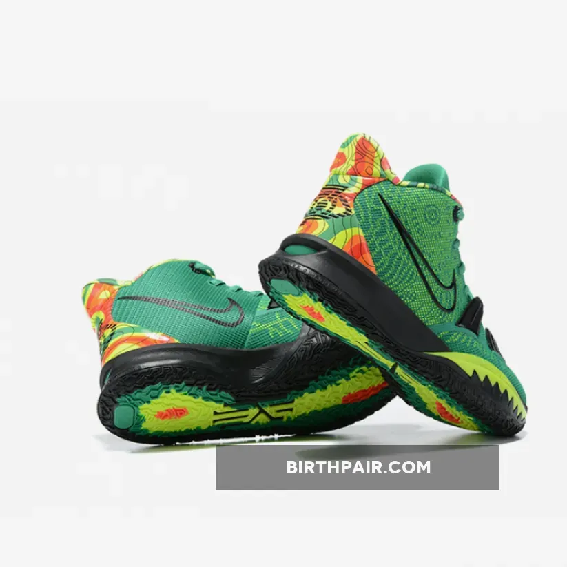 This edition of the Nike Kyrie 7 sports a similar Green base as a nod to a Green screen with the bold weather inspired heat-map pattern wrapping the heel.