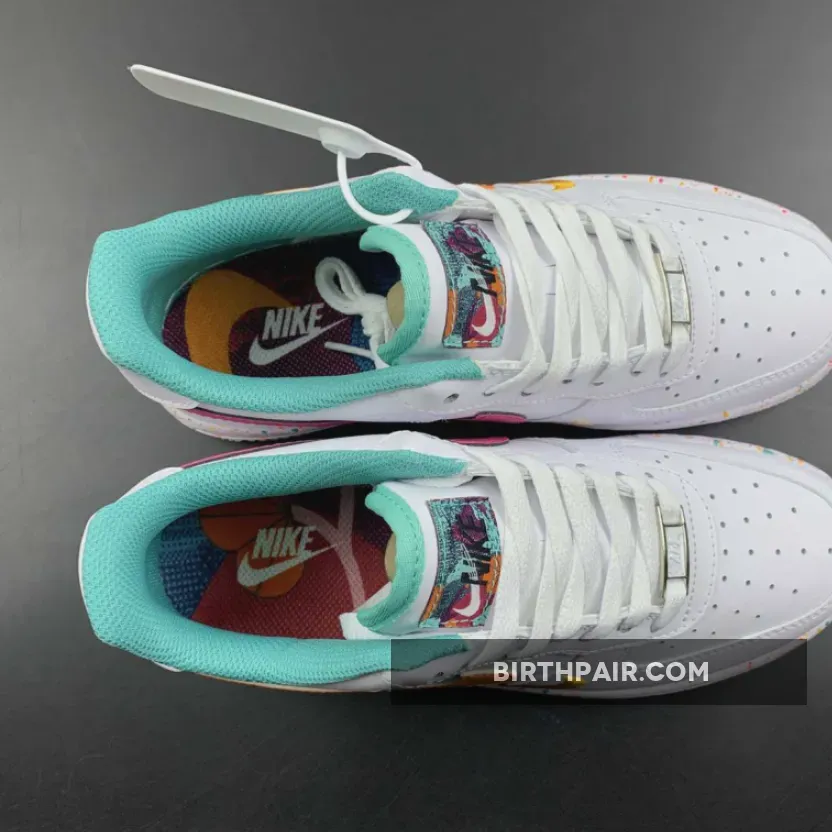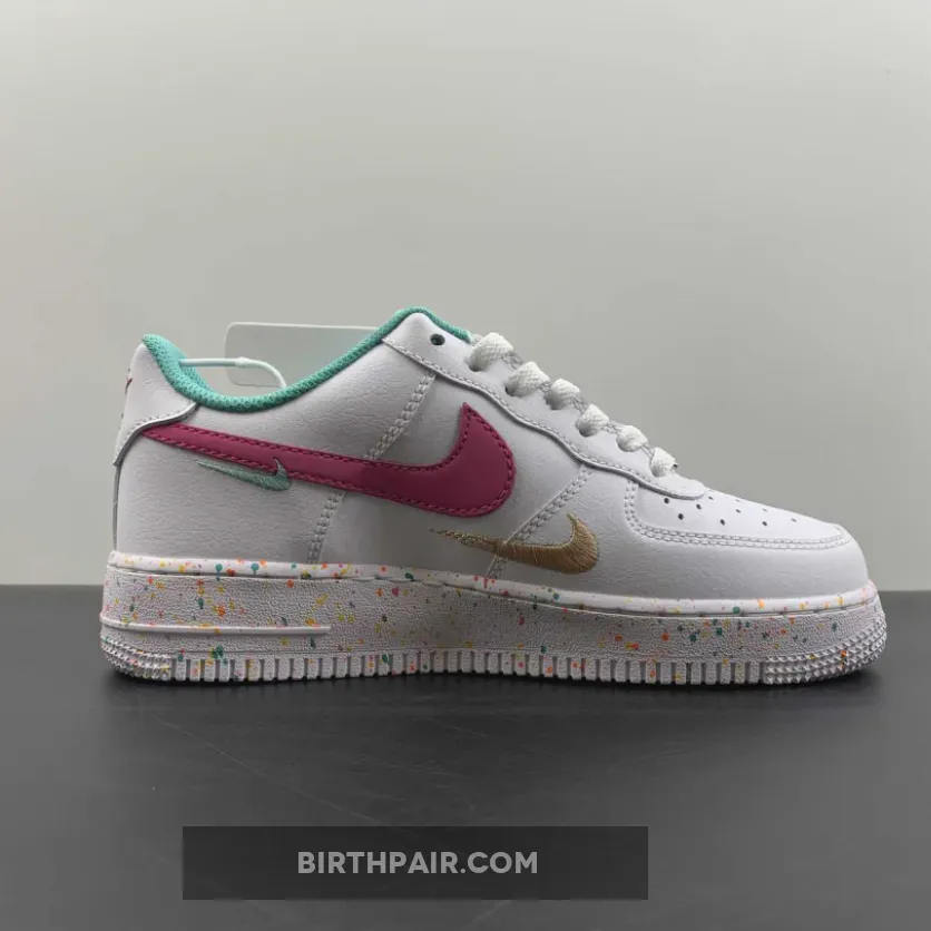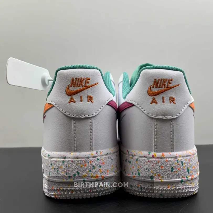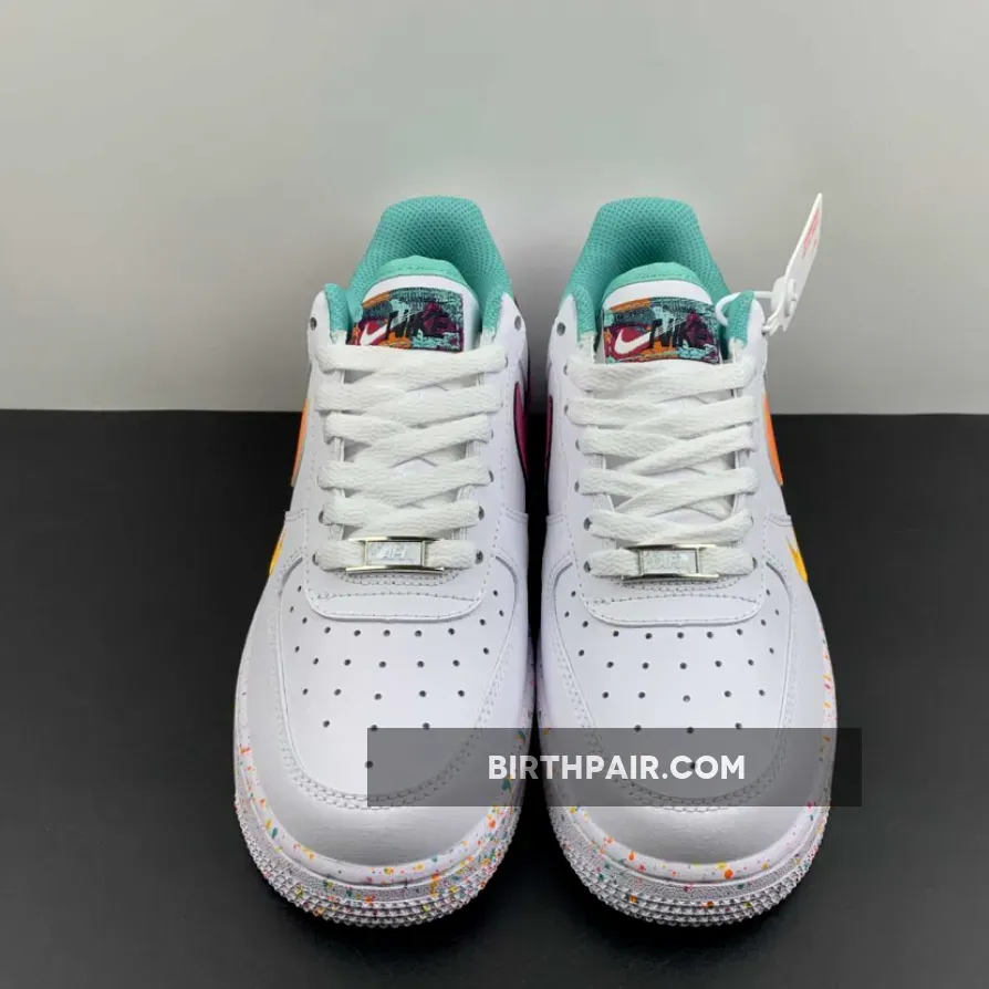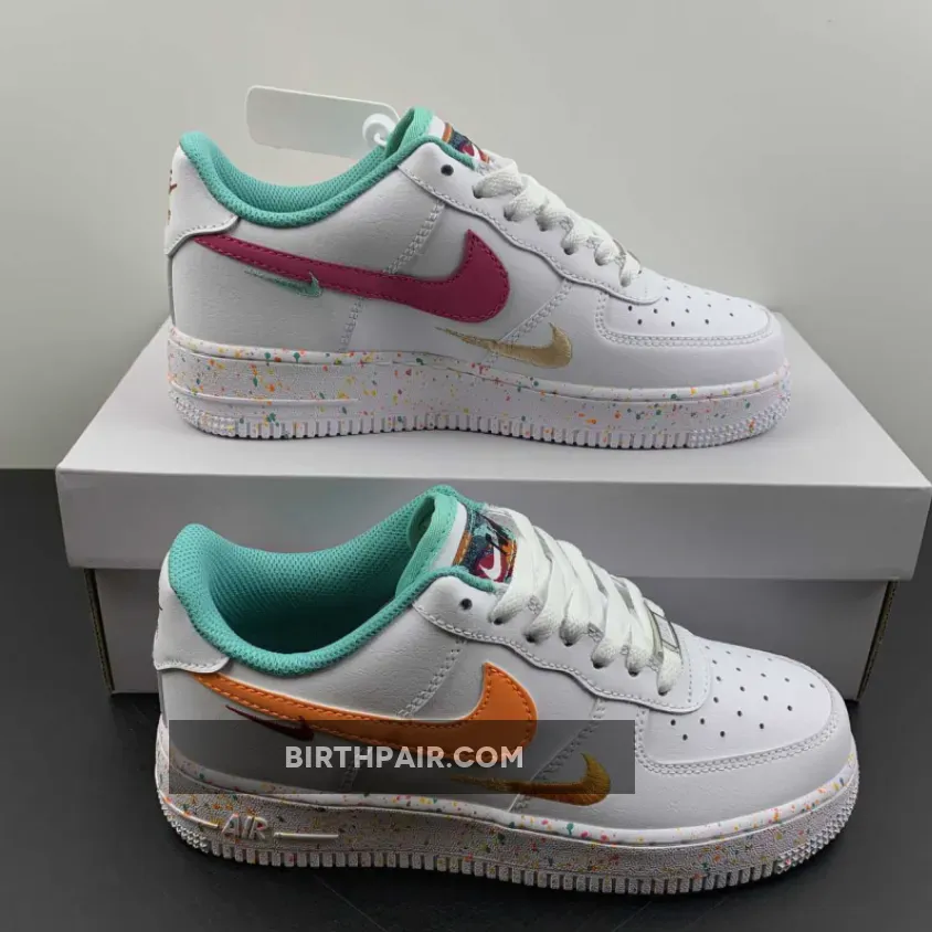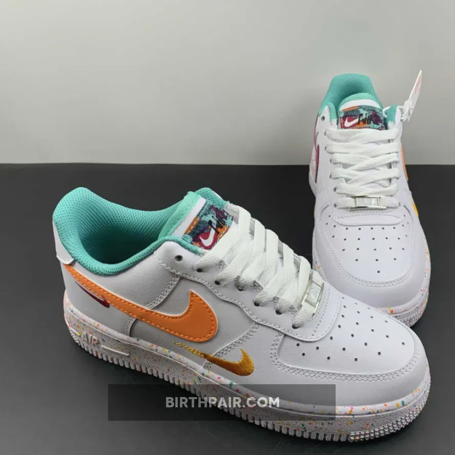 AF1 but make it extra fun. The Nike Air Force 1 Low GS White Teal begins with a crisp smooth white leather upper which includes the perforated toe, quarters and overlays. It is then decorated with playful additions such as the triple Swoosh design which sees the side panels featuring a leather Swoosh — orange for the lateral side, and pink for the medial side — with tangerine and berry red embroidered Checks on its side. The shoe is further brightened up by the teal lining along the tongue and the inner portion.