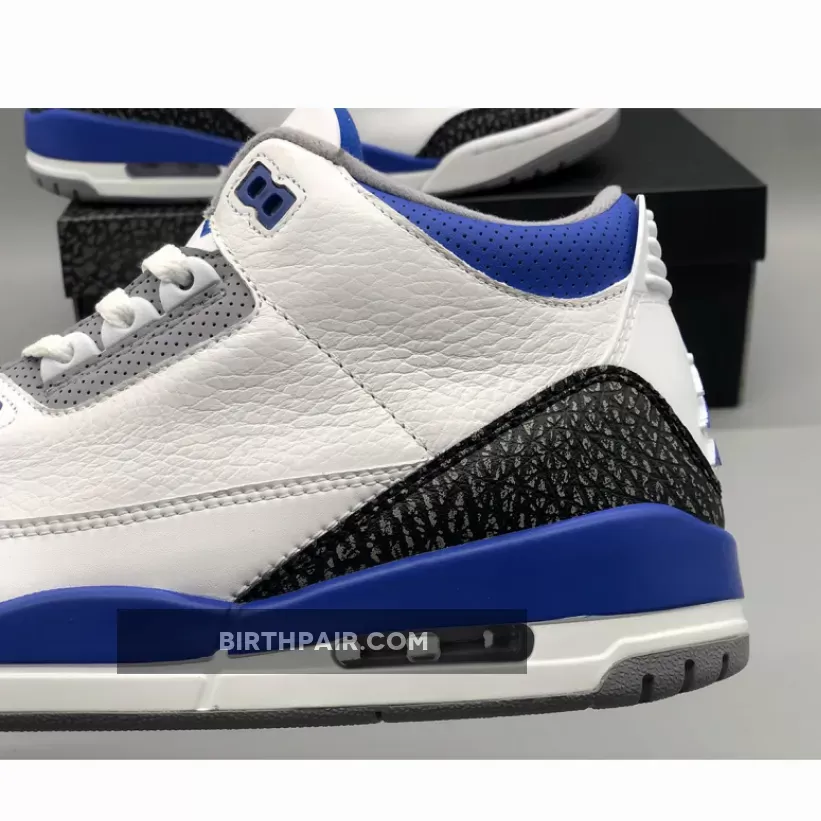 This Air Jordan 3 features a White leather base with Black 3M reflective elephant print overlays highlighted with Blue contrasting accents atop a signature Grey rubber outsole. Tumbled leather base layers and perforated mid-foot and lower throat panels opt to go with the classic white and light gray color-blocking. Reflective cement overlays that land along the toe tips and heels are dialed with dark gray tint, while the eyelets, tongue branding and Jumpman logos on the heels are swathed in the shoe’s titular shade. The midsoles which house an exposed Air unit towards the rear are offset with more “Racer Blue” accents that apply to the molds that rest just above.