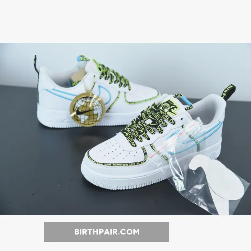 The second shoe, the Air Force 1 ’07 LV8 “White Barely Volt,” takes a more conservative approach, opting for a clean white leather upper with a normative “Barely Volt” Swoosh on the lateral and medial sides. The same black and volt “Worldwide” tongue branding appears on the shoe, finally finished by “Worldwide” text in volt as well as black and white that runs horizontally from the lace cage. Both shoes come packaged with a few Swoosh stickers, a hangtag, and a special pin.